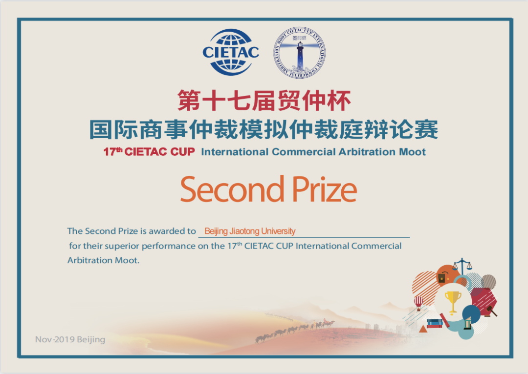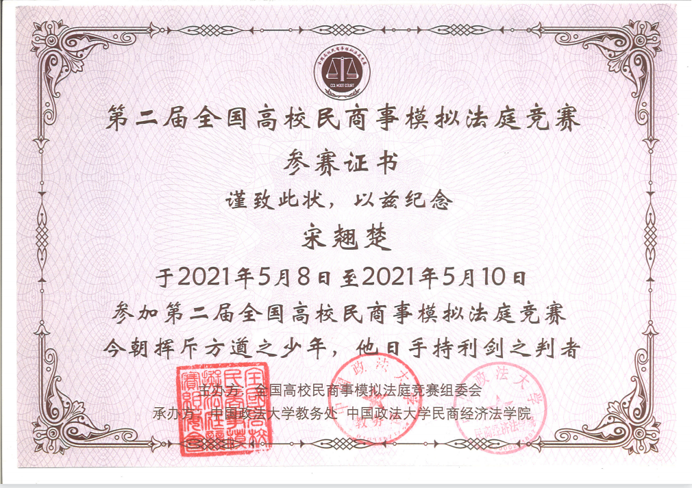 2019年,宋翘楚作为团队最小成员,和研究生学长学姐参加了全英文的贸仲杯国际商事仲裁辩论赛,协助团队完成相关案例和法条等的检索工作,最终取得全国二等奖。