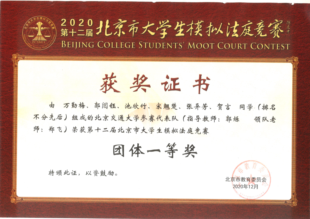 2020年,她参加了北京市大学生模拟法庭竞赛,在清北人政等传统法学强校都全力参赛的情况下获得一等奖,创学院最好成绩。