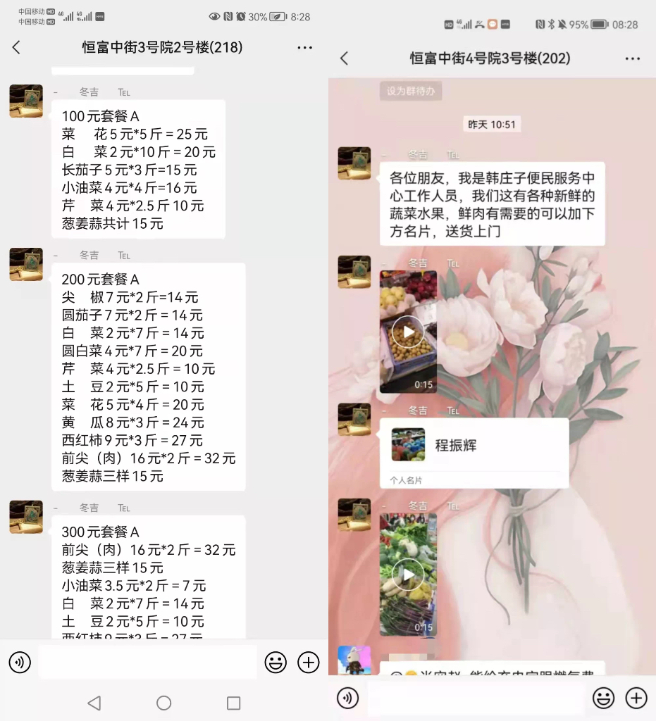工作人员对韩庄子便民市场的物资类别、总量和零售价格进行统计,将统计表通过楼栋微信群通报给居民。为了方便居民选购以及市场配货,特别设计了100、200、300元三种套餐供居民选择。