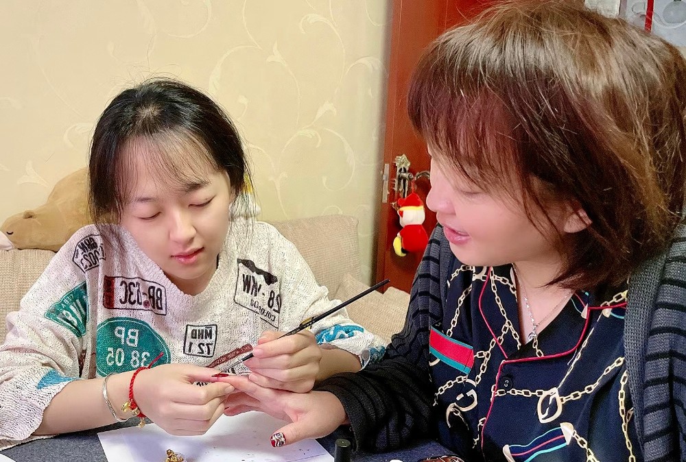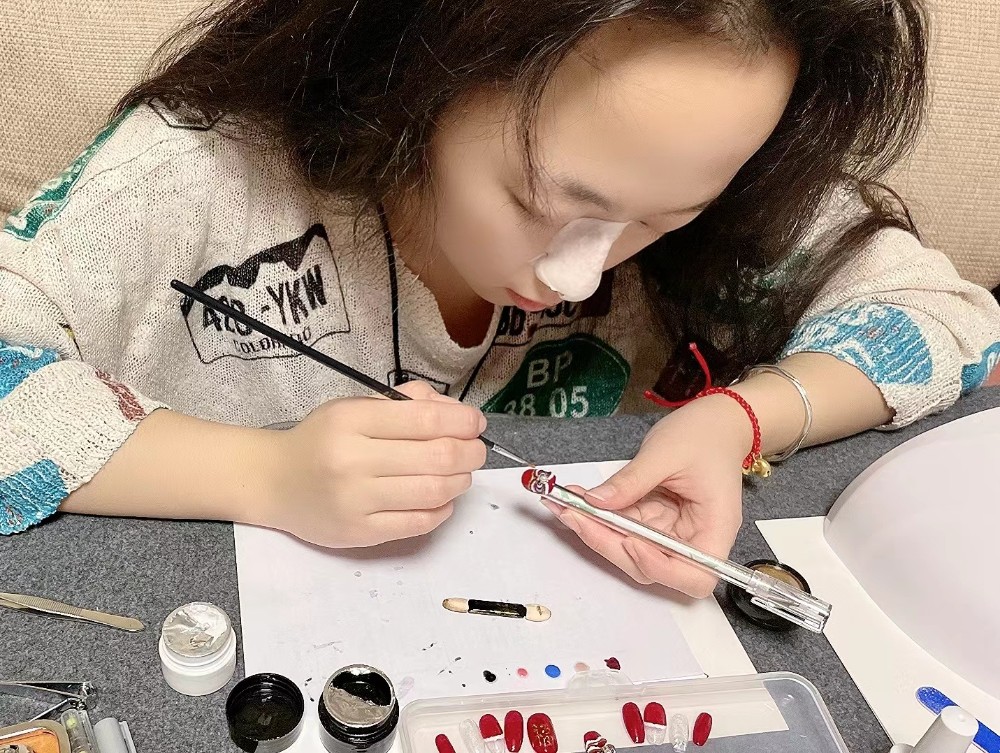 2月2日,大年初二,市民周心怡自己设计绘画了一套虎头甲片,装饰在妈妈手上,为母亲献上了一份“独一无二”的爱。
