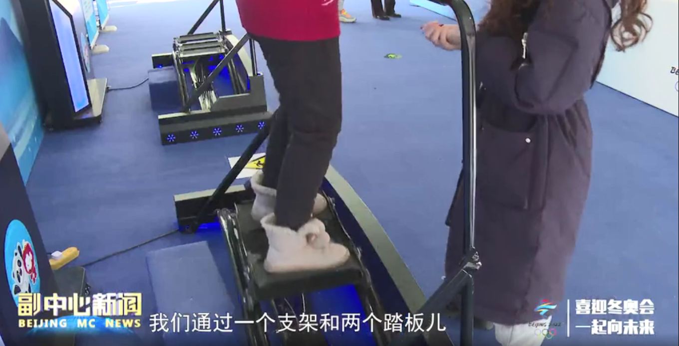冰雪运动科技体验区工作人员王静怡:“VR体验滑雪它是一个非常灵活性的运动,我们通过一个支架和两个踏板儿模拟了一个滑雪的场景,然后戴上VR眼镜,就可以身临其境地体验到滑雪的感觉。”