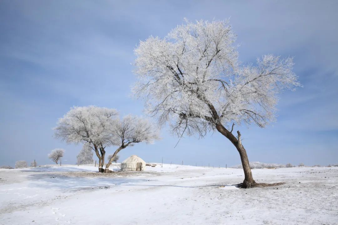 蓝色苍穹覆盖着白色大地。