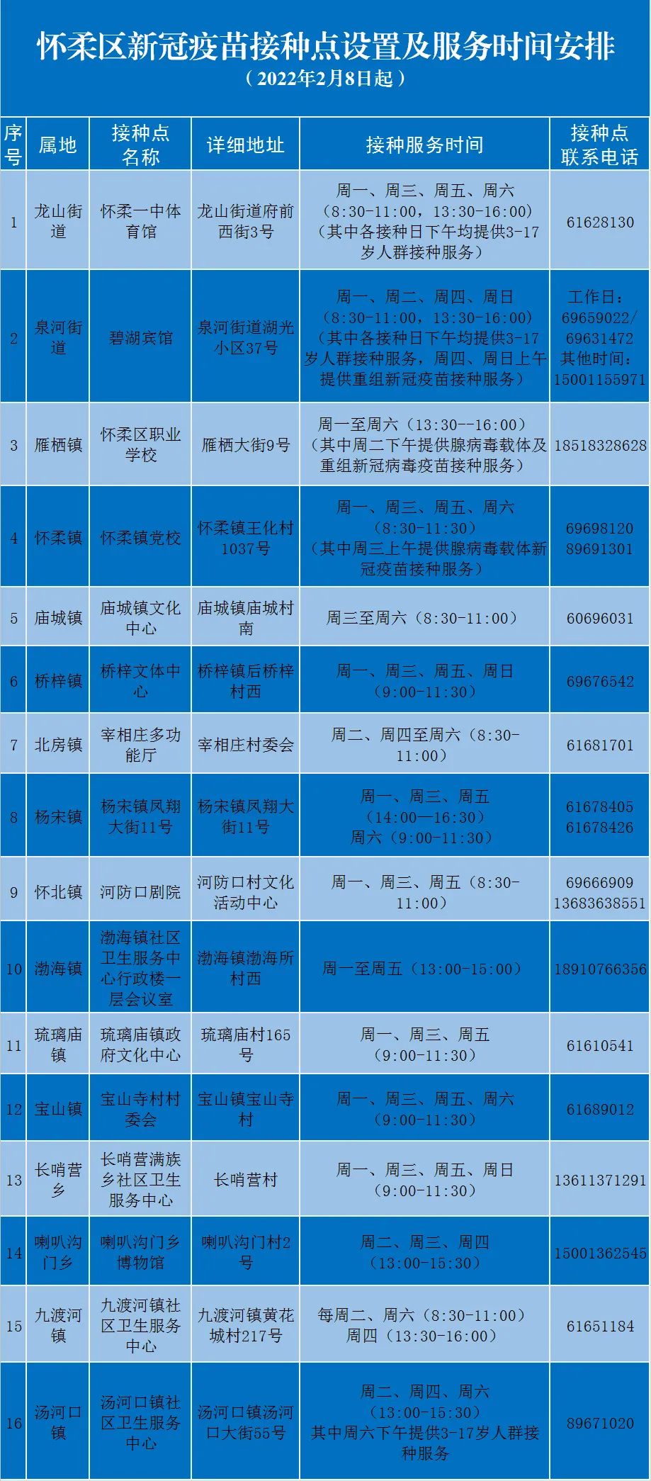 2月8日起更新!怀柔区新冠疫苗接种点设置及服务时间安排