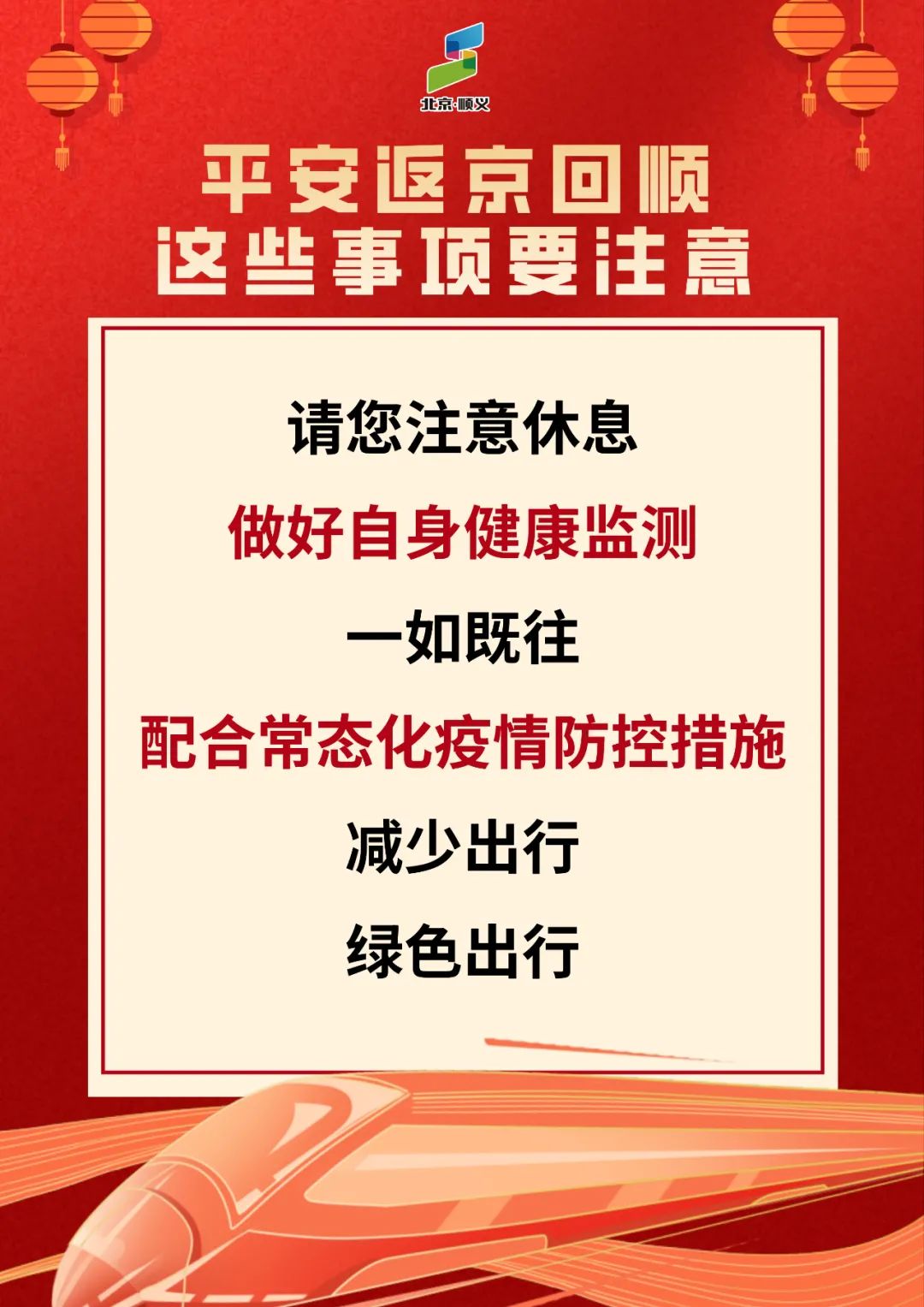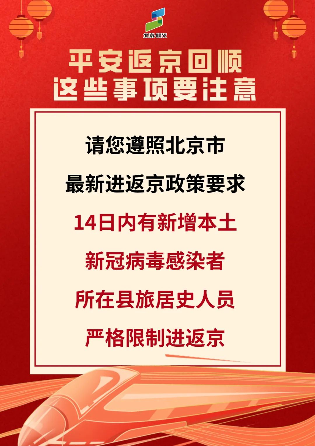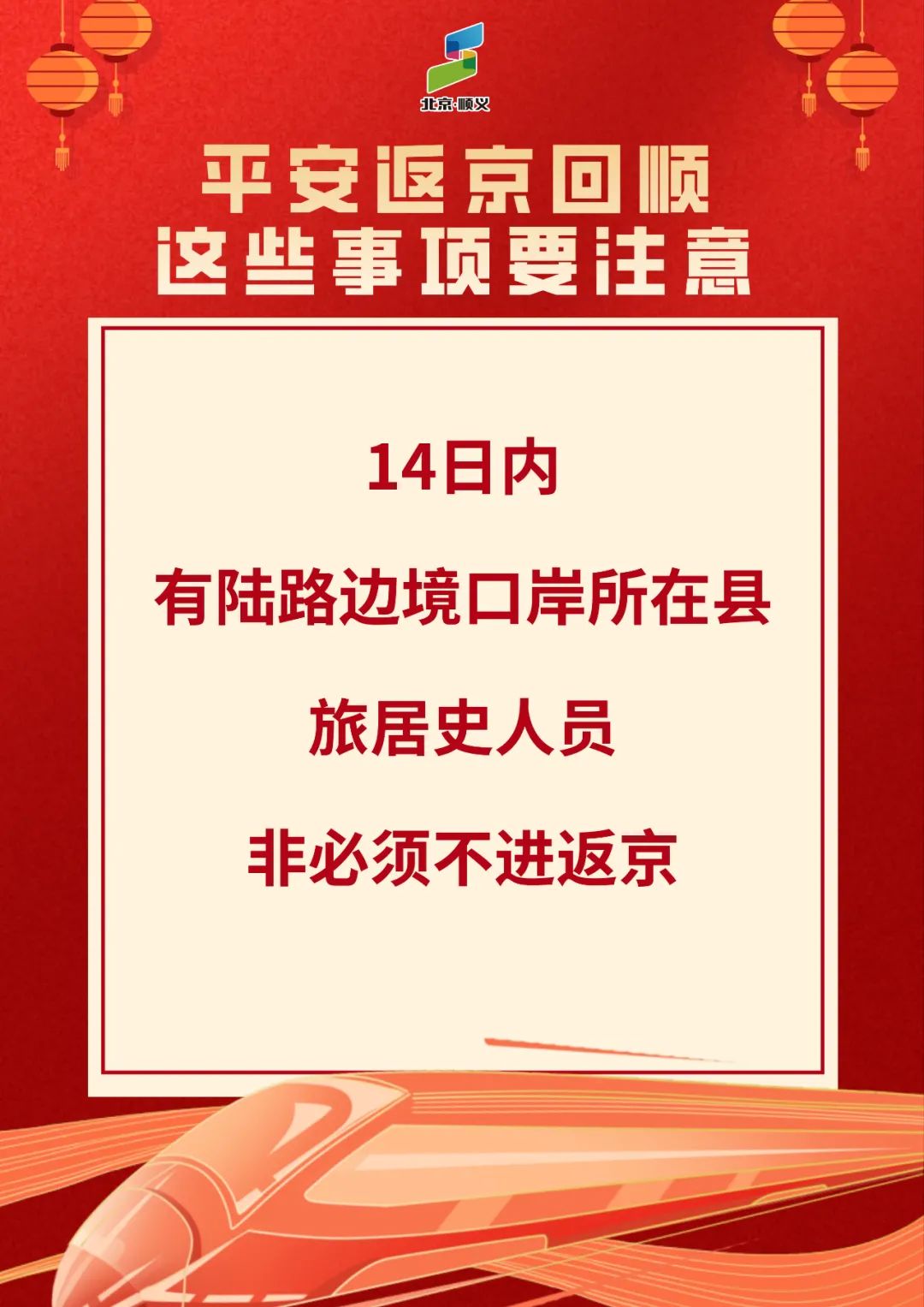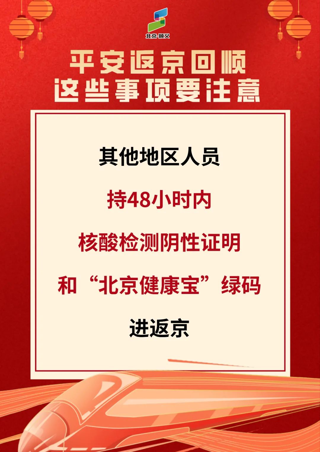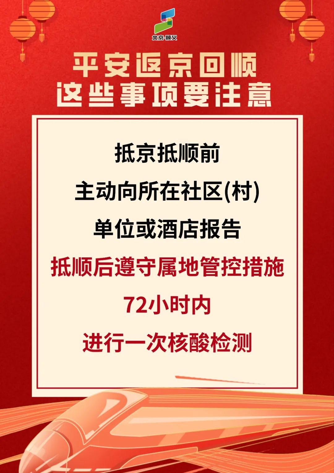 春节假期已结束,进返京人员增多,当前疫情还没有结束,仍不能掉以轻心,不能有丝毫的松懈。顺顺在此提醒广大市民朋友,要增强防控意识,做好个人防护,严格执行进返京政策,所有进返京人员在抵京后72小时内需进行一次核酸检测。进返京人员需按规定落实核酸检测、健康监测等防控措施。正在接受隔离、管控的人员请严格执行隔离管控措施,隔离期间出现任何身体不适要及时报告工作人员,切实履行防控责任。