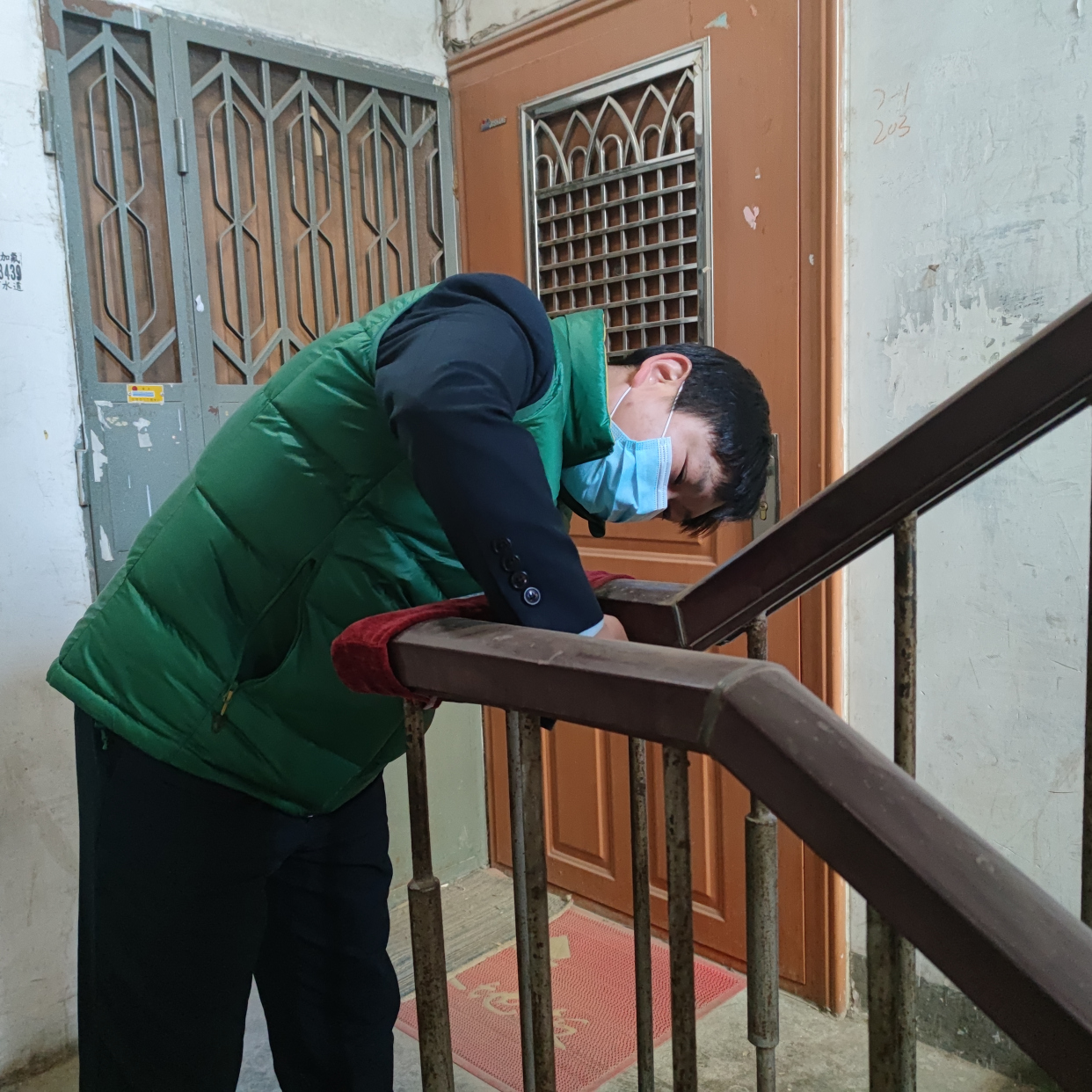 2月9日一大早,家住丰台区马家堡街道嘉园一里7号楼的陈景妹刚刚买菜回来,惊喜的发现,自家单元门的楼梯上有了小变化。一块红色灯芯绒牢牢的套在楼梯扶手的拐角处,陈景妹笑着说:“这样可安全多了,小红布可是帮了大忙。”