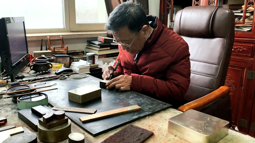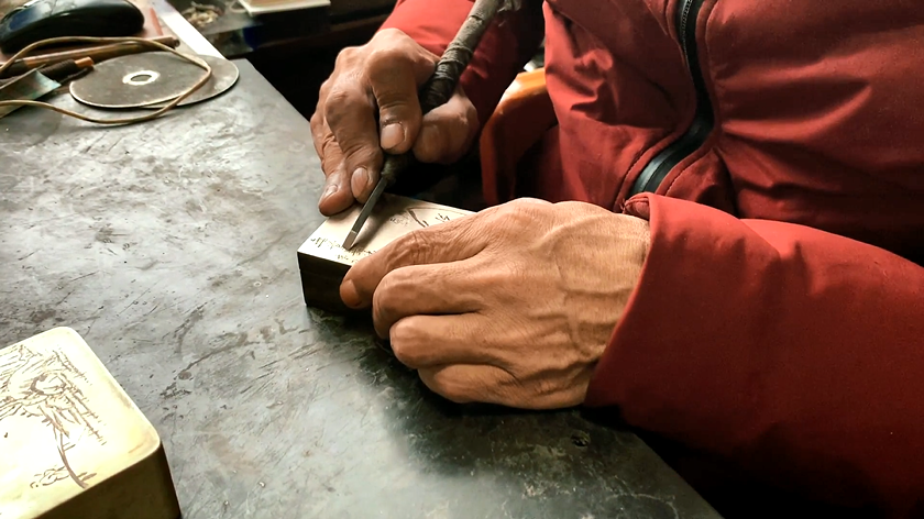 刻铜技艺非常复杂,先要用笔墨将要刻的东西画于铜面上,再用特制的钢刀进行刻画,“虽刻犹写”是刻铜的至高境界。与南方浙派擅用锤子边击打边运刀的刻铜方式不同,宋国柱刻铜全凭手劲儿。右手因为长期刻铜的原因,手指头粗大,指肚上的老茧很厚,还深深地沁着铜色。