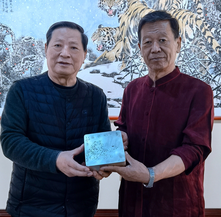 为了迎接虎年,宋国柱与画虎名家田茂怀联袂献上了一件刻铜作品——“事事如意”铜墨盒,上有田茂怀先生亲笔题画《事事如意图》,再由宋国柱刻于铜墨盒上。两位艺术家倾力合作,想借此件作品表达对全市人民的祝福。