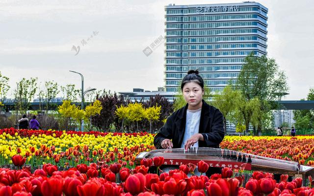 2021年4月14日,秦皇河公园郁金香花丛中的古筝演奏者。