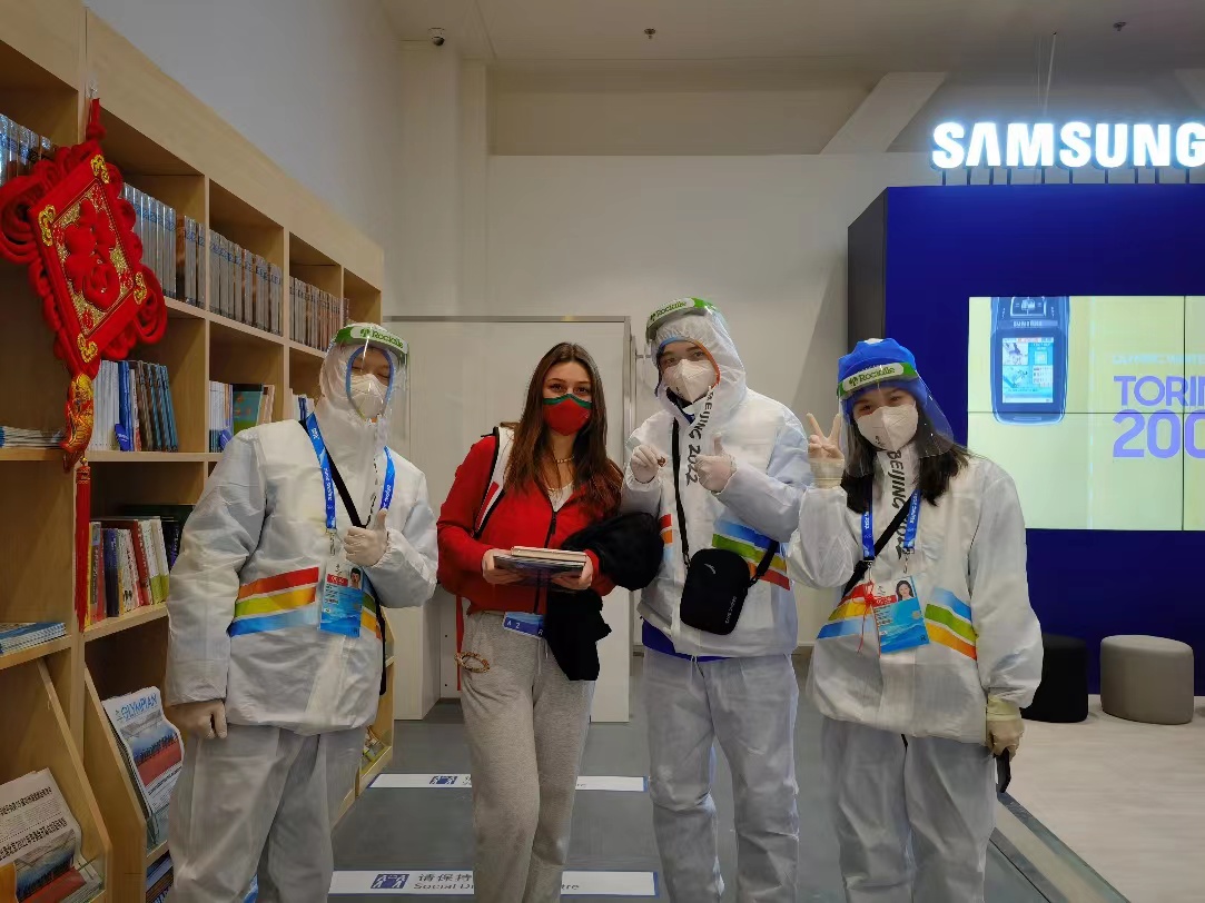 “Hello!Hi!You are welcome……”在延庆冬奥村广场区各业态门口,冬奥村管理业务领域广场区志愿者亲切活泼的问候声此起彼伏。虽然他们身穿隔离衣、头戴面屏以及口罩,几乎遮挡了全部面容,但志愿者们始终坚持用最美的微笑,向外国运动员传递团结友好的问候。