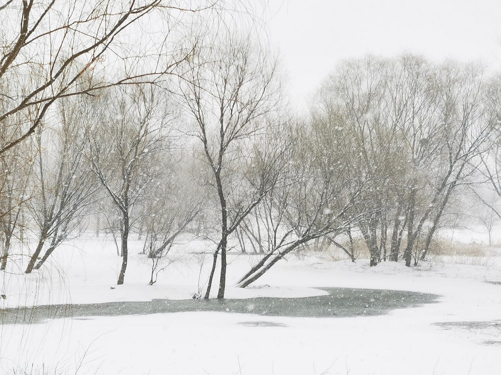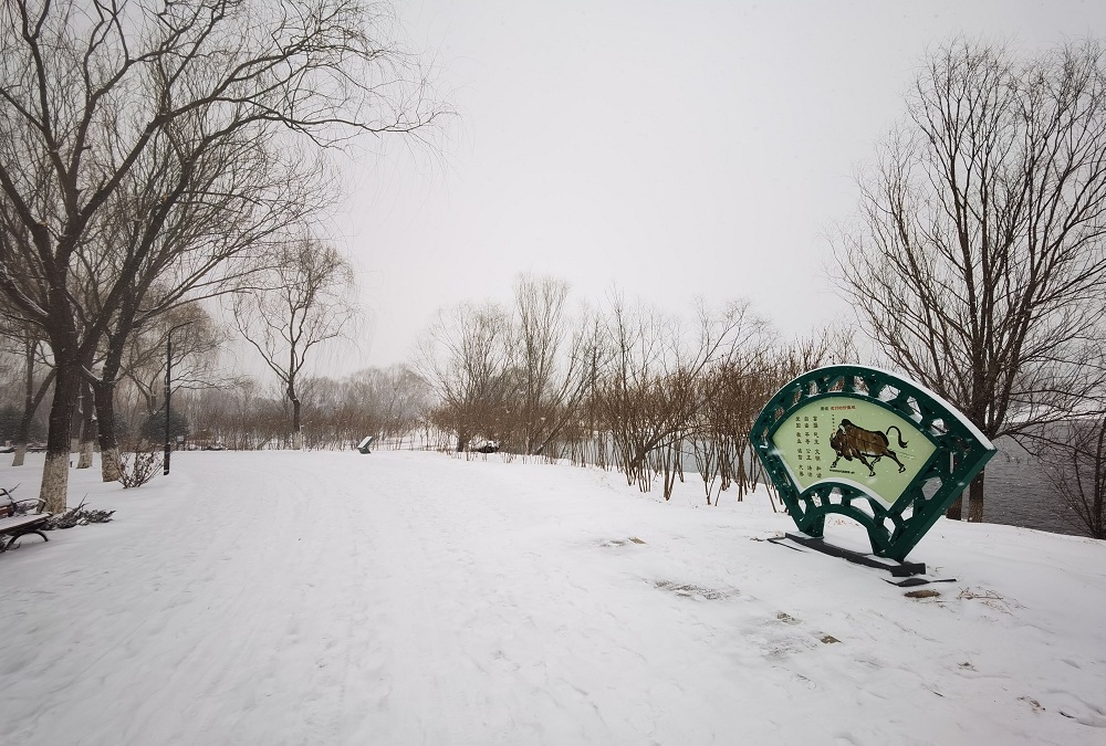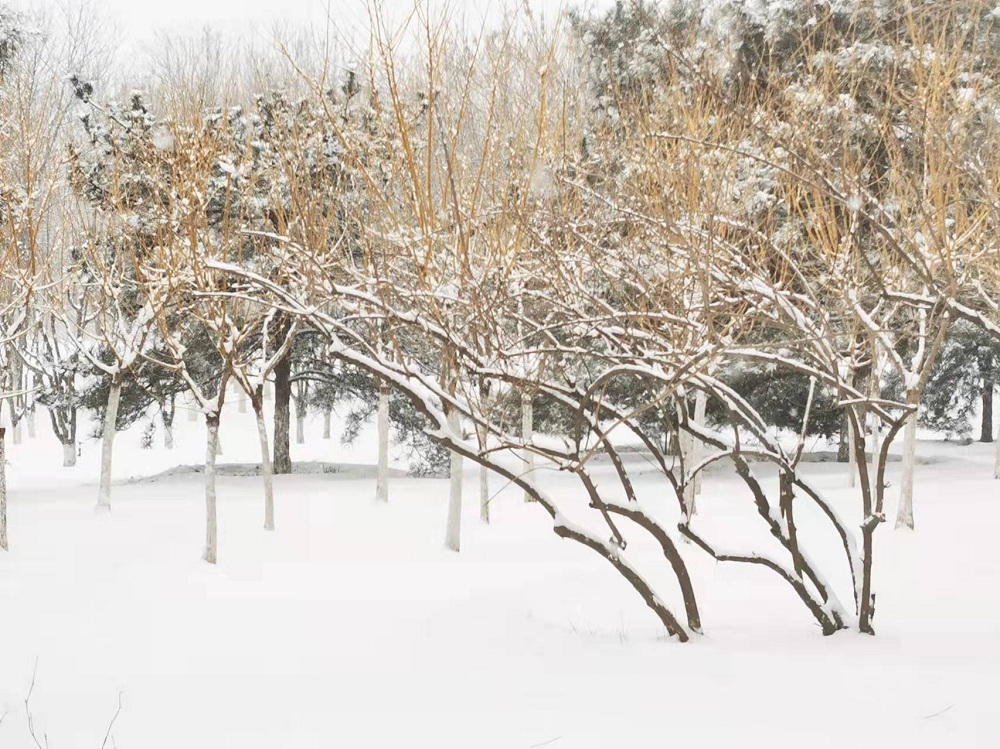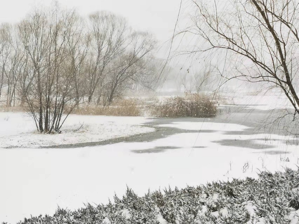 图为滨河森林公园。 今天,大片雪花漫天飞舞,昌平大街小巷“变身”冰雪世界,呈现出与往日不同的迷人景致。雪掩青松,使松枝多了分灵动,泛黄色的树叶,也在皑皑白雪中,戴上了俏皮的“帽子”,格外喜人。