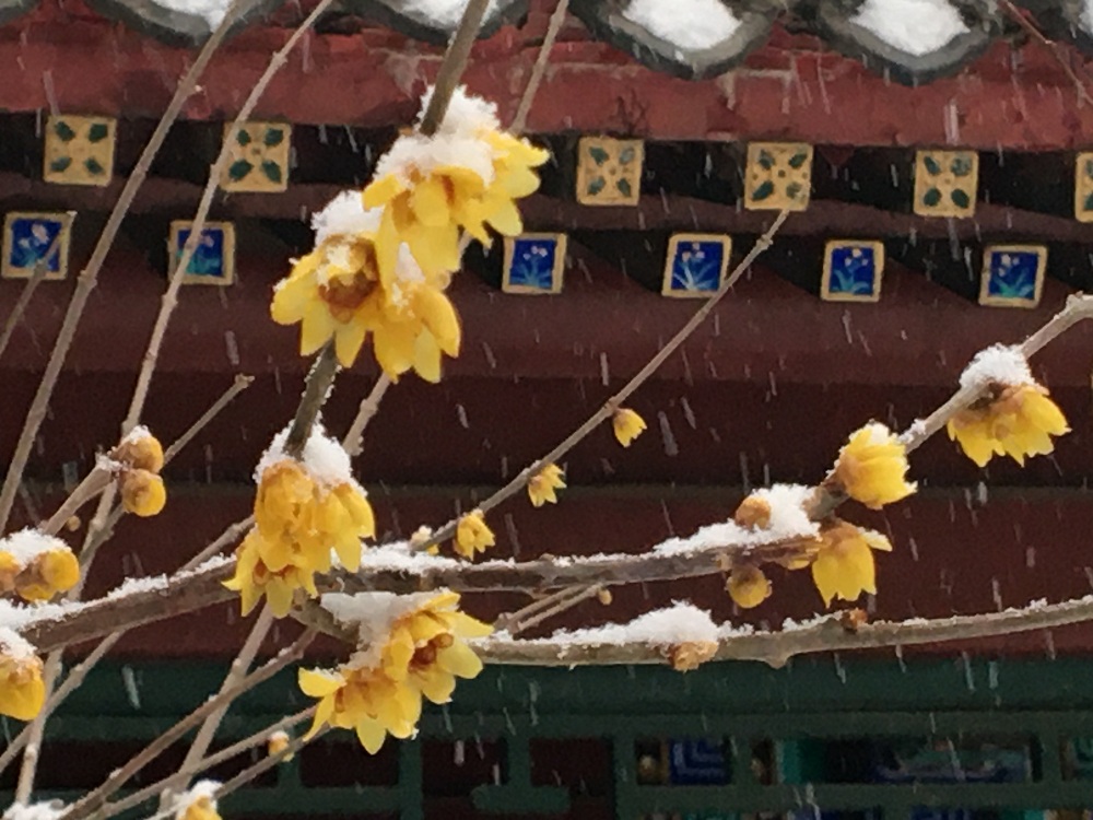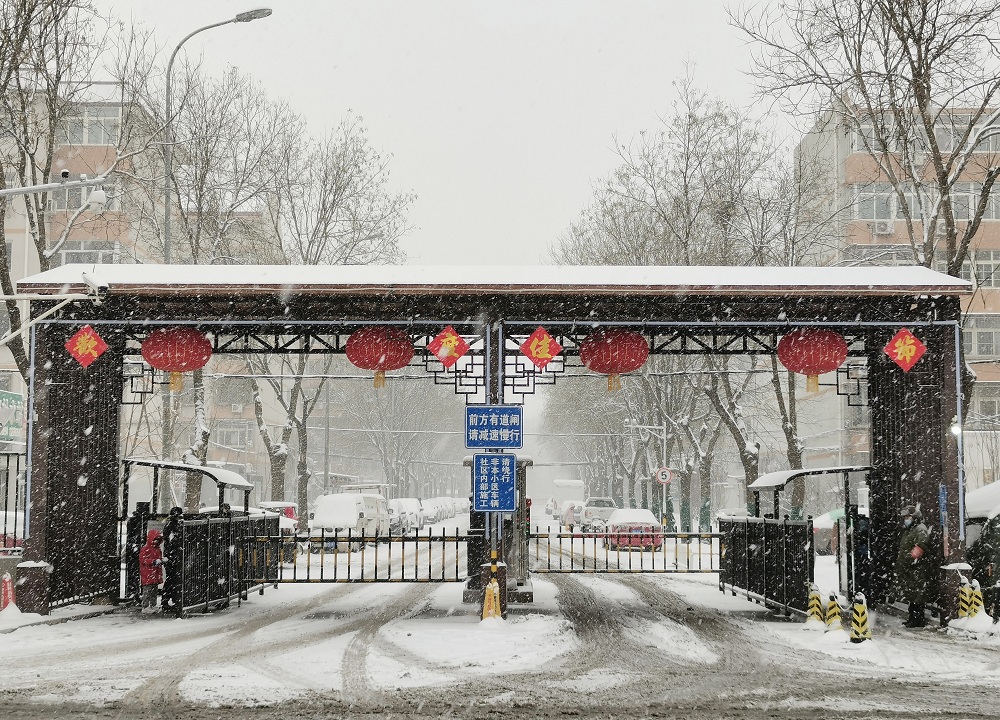 图为昌盛园小区南门。 今天,大片雪花漫天飞舞,昌平大街小巷“变身”冰雪世界,呈现出与往日不同的迷人景致。雪掩青松,使松枝多了分灵动,泛黄色的树叶,也在皑皑白雪中,戴上了俏皮的“帽子”,格外喜人。
