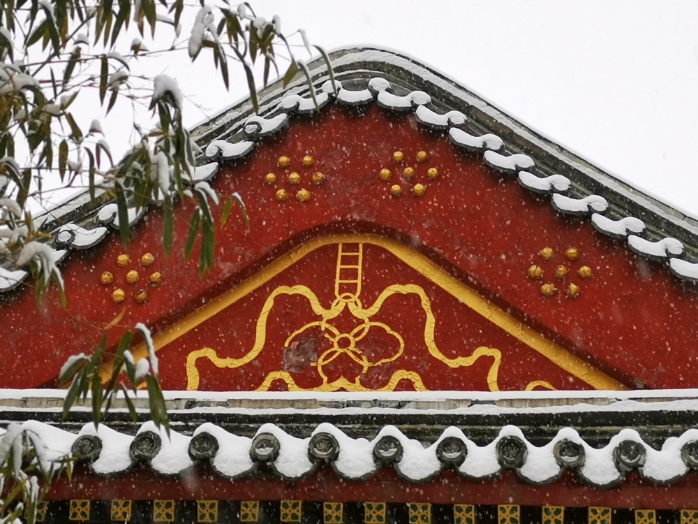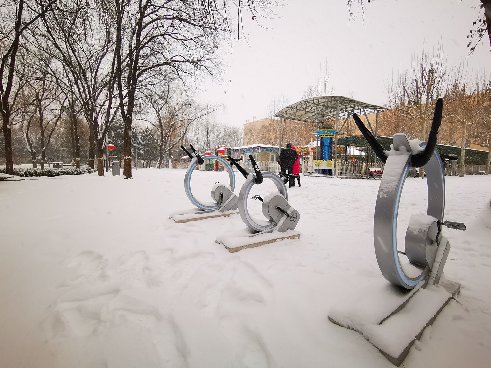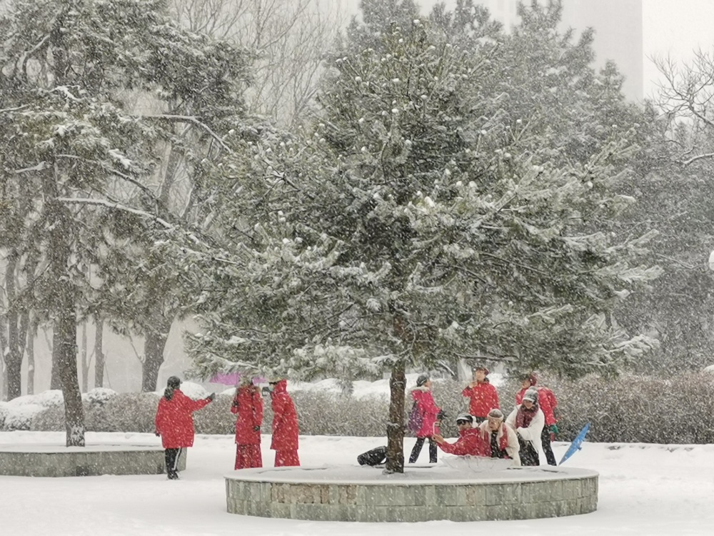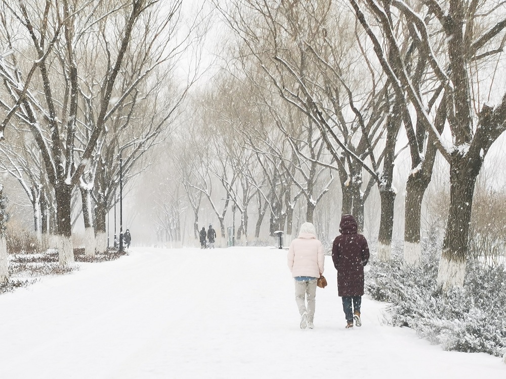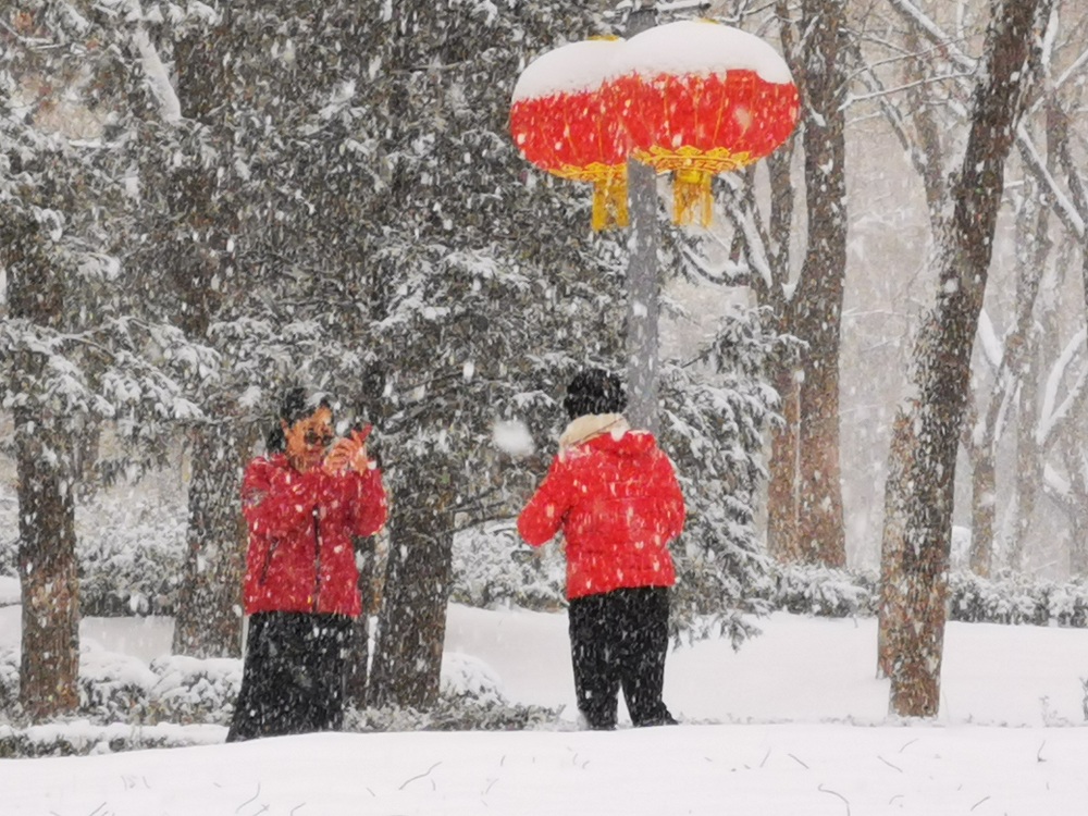 图为昌平公园。 今天,大片雪花漫天飞舞,昌平大街小巷“变身”冰雪世界,呈现出与往日不同的迷人景致。雪掩青松,使松枝多了分灵动,泛黄色的树叶,也在皑皑白雪中,戴上了俏皮的“帽子”,格外喜人。