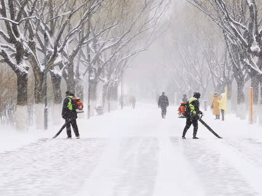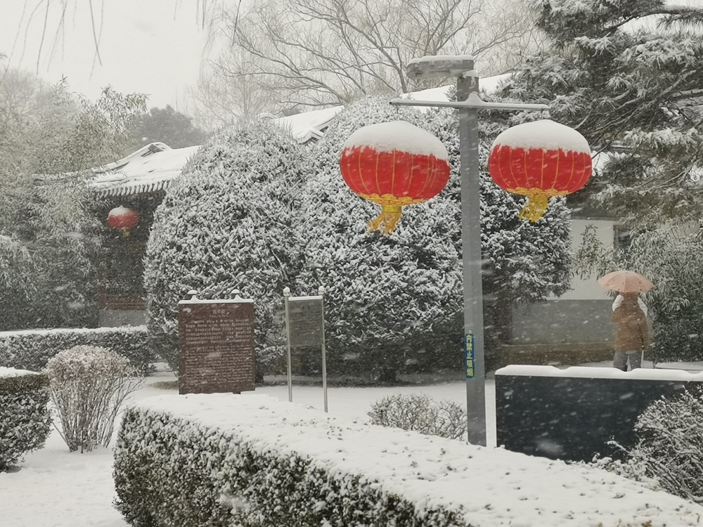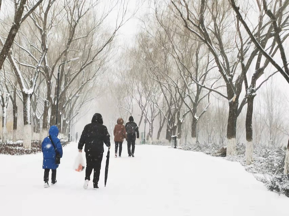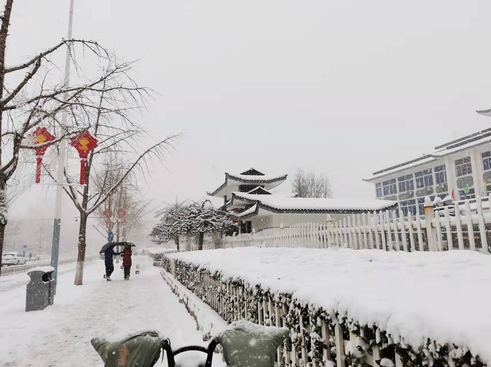 图为政府街。 今天,大片雪花漫天飞舞,昌平大街小巷“变身”冰雪世界,呈现出与往日不同的迷人景致。雪掩青松,使松枝多了分灵动,泛黄色的树叶,也在皑皑白雪中,戴上了俏皮的“帽子”,格外喜人。