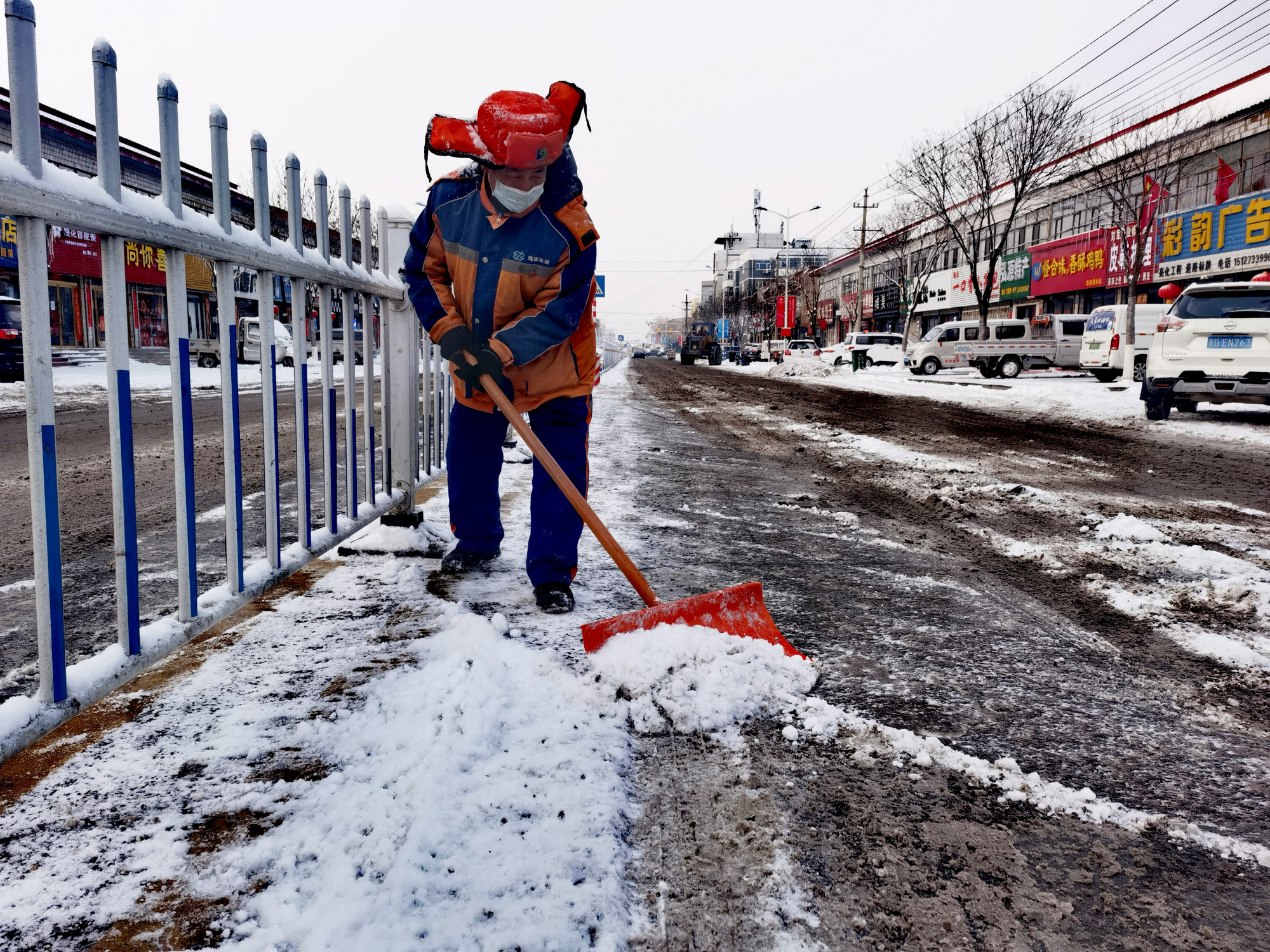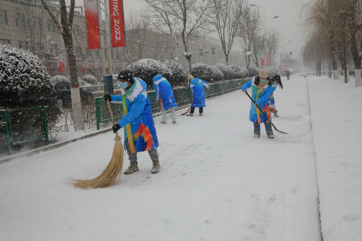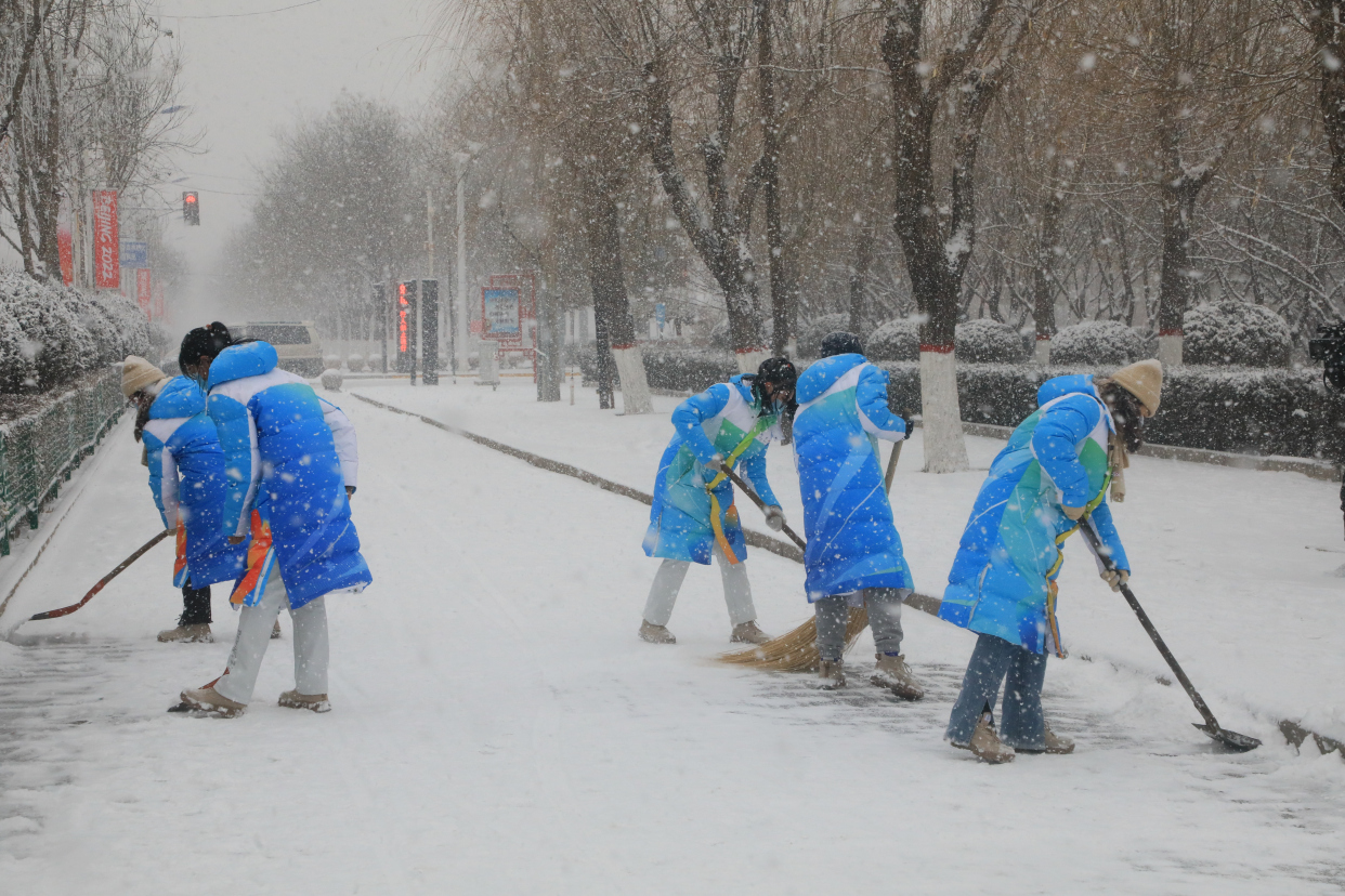 2月12日至13日,河北省张家口市阳原县遭遇强降雪天气,全县普降大雪,最多可达6cm。为保障人民群众的出行安全,公安、交通、环卫、城管等部门、志愿者以及商户群众从13日一早纷纷投入到清理积冰积雪行动中去。“以雪为令、闻雪而动、随下随清、雪停路净”,那一抹抹“色彩”,为寒冷的雪天增添了足足的温暖。
