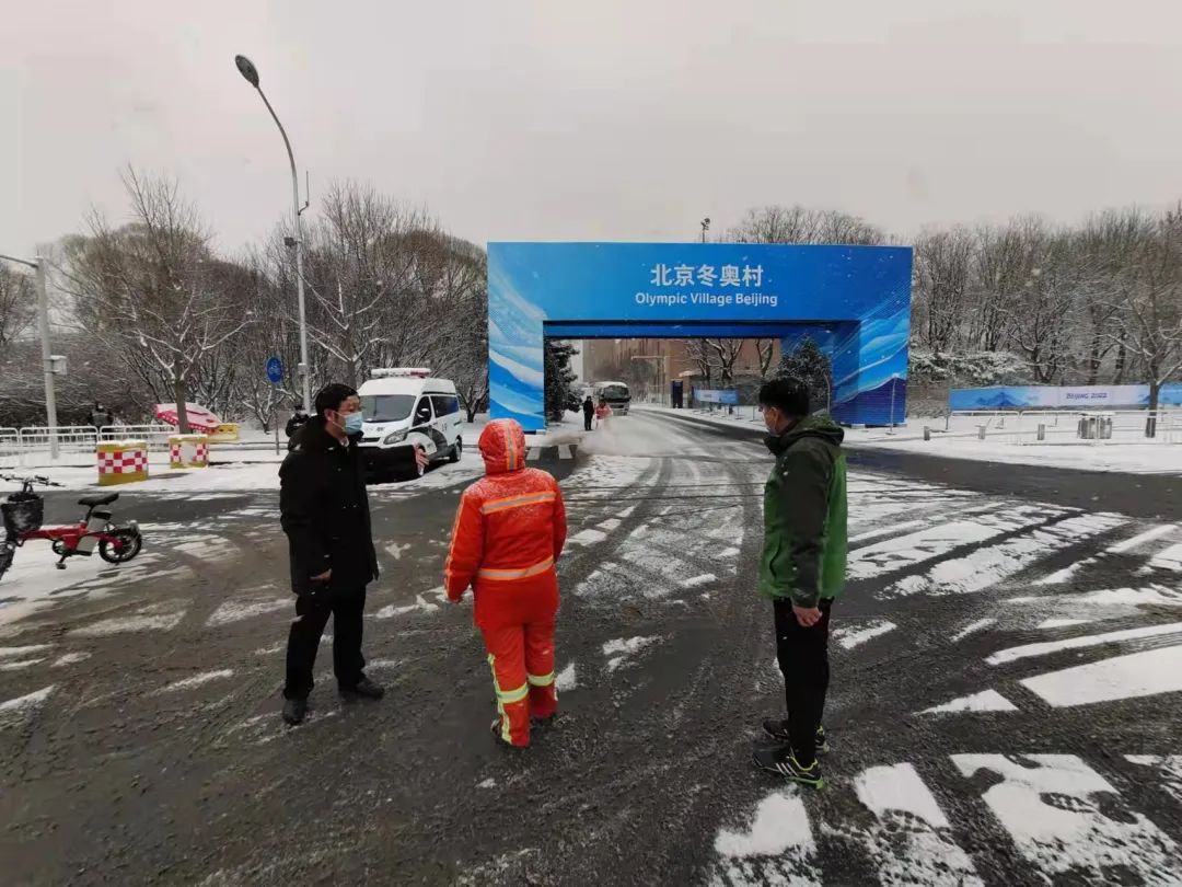 区城市管理委党组成员、副主任蔡睿冒雪带队对奥运场馆周边地区扫雪铲冰工作进行检查。检查现场,蔡睿副主任详细了解了冬奥场馆的安全防护情况以及道路通行保障措施。