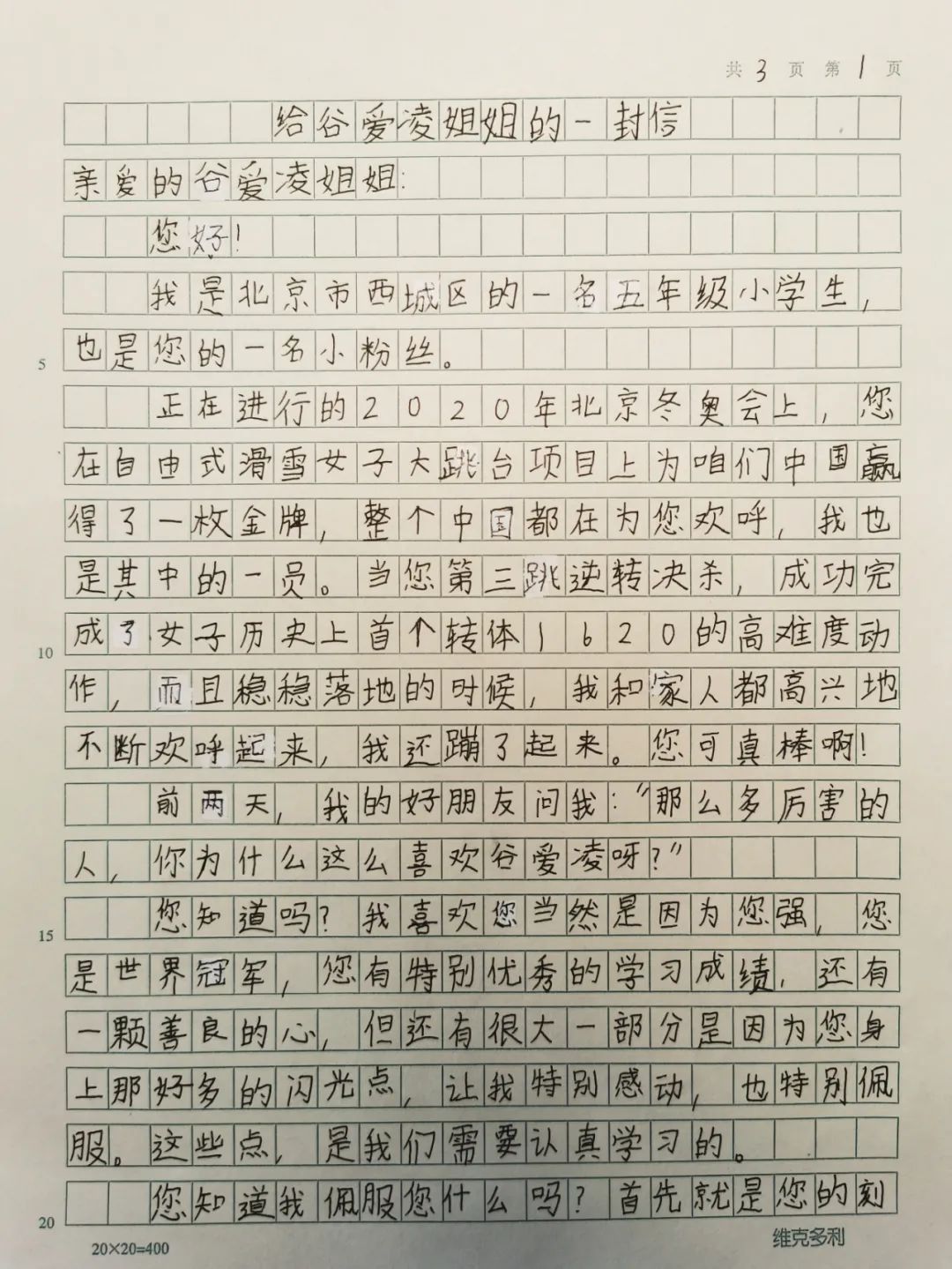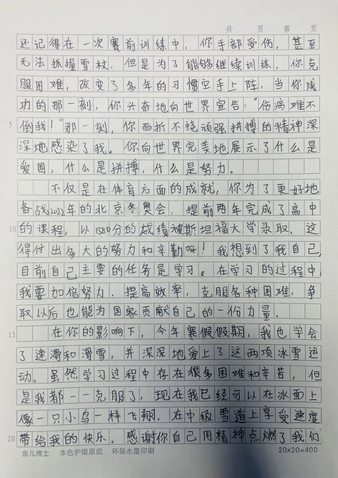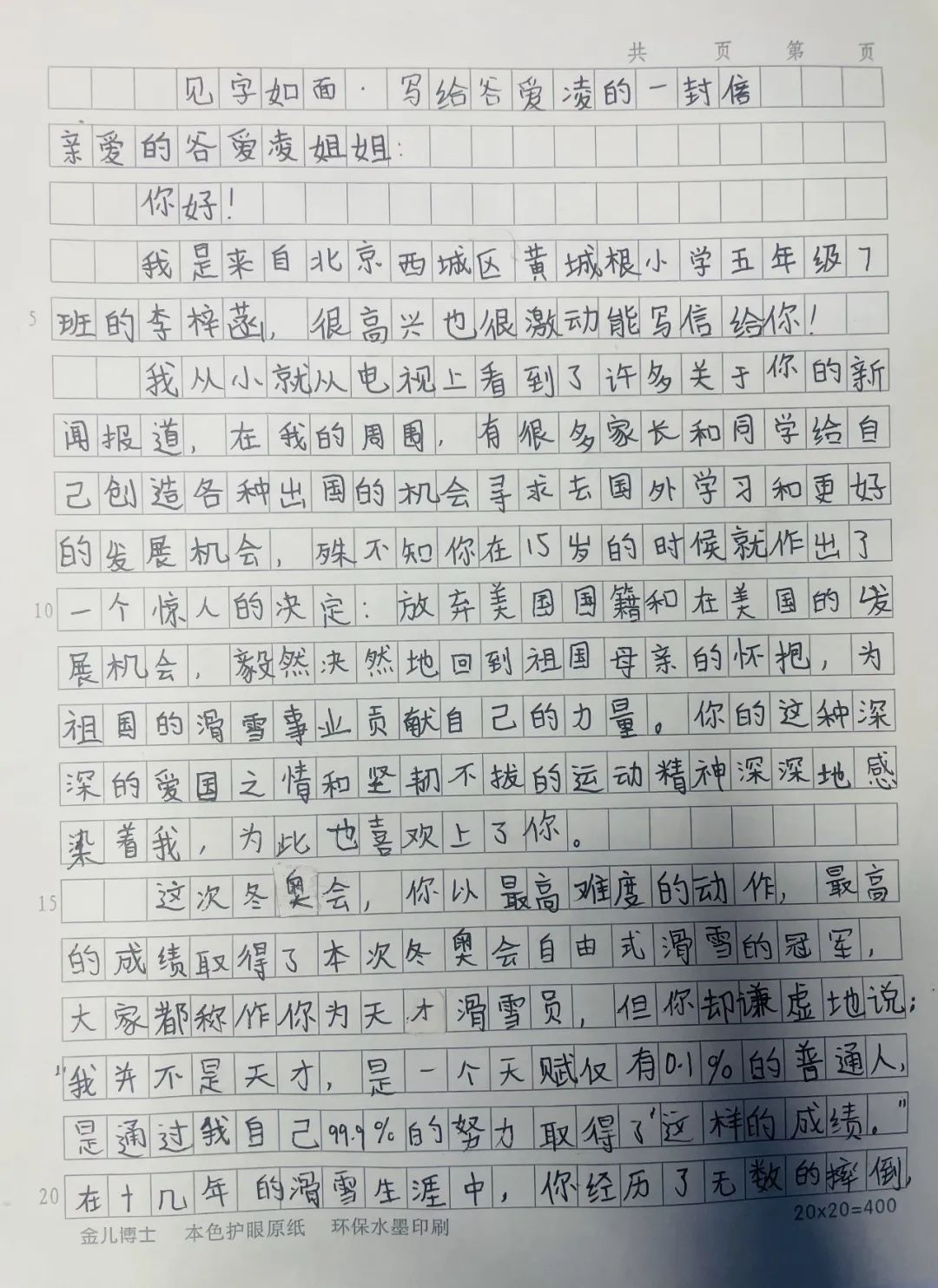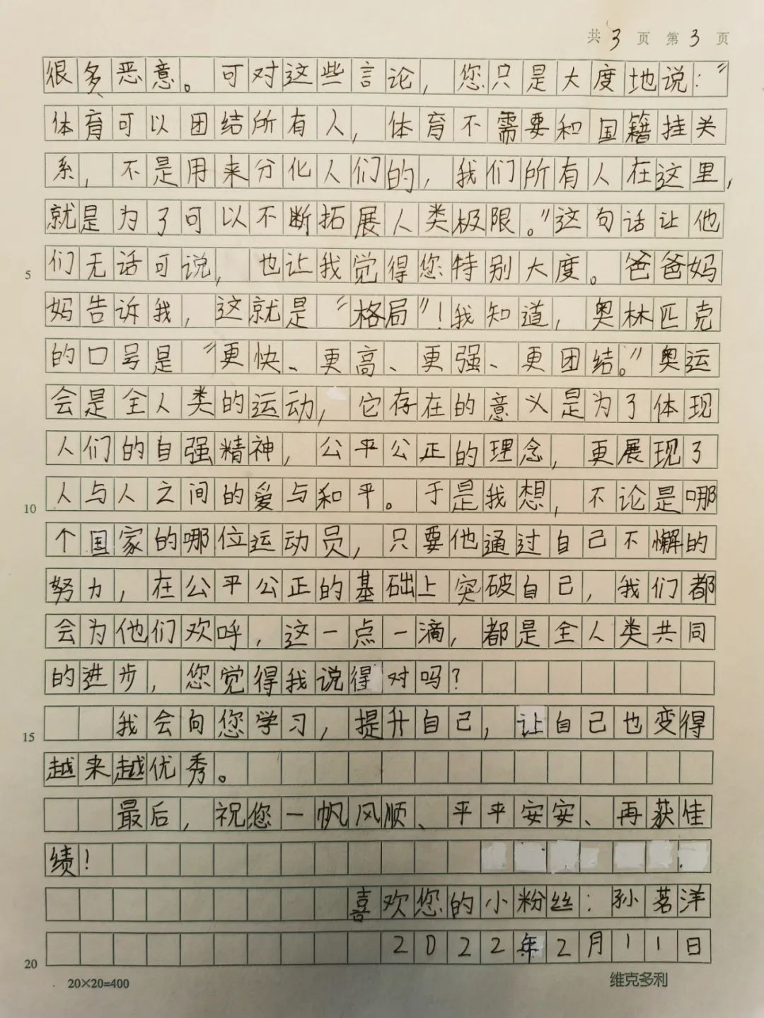 ⬆西城区椿树馆小学五(4)班孙茗洋致信谷爱凌