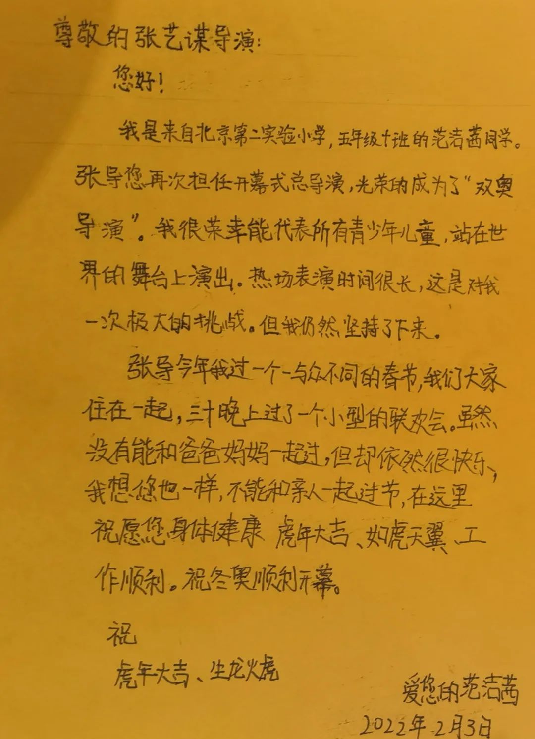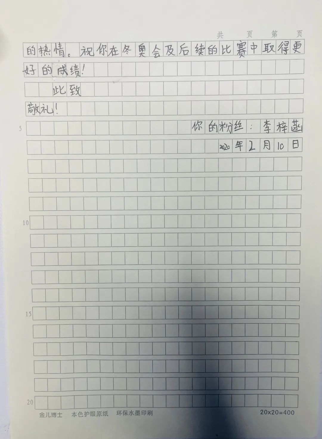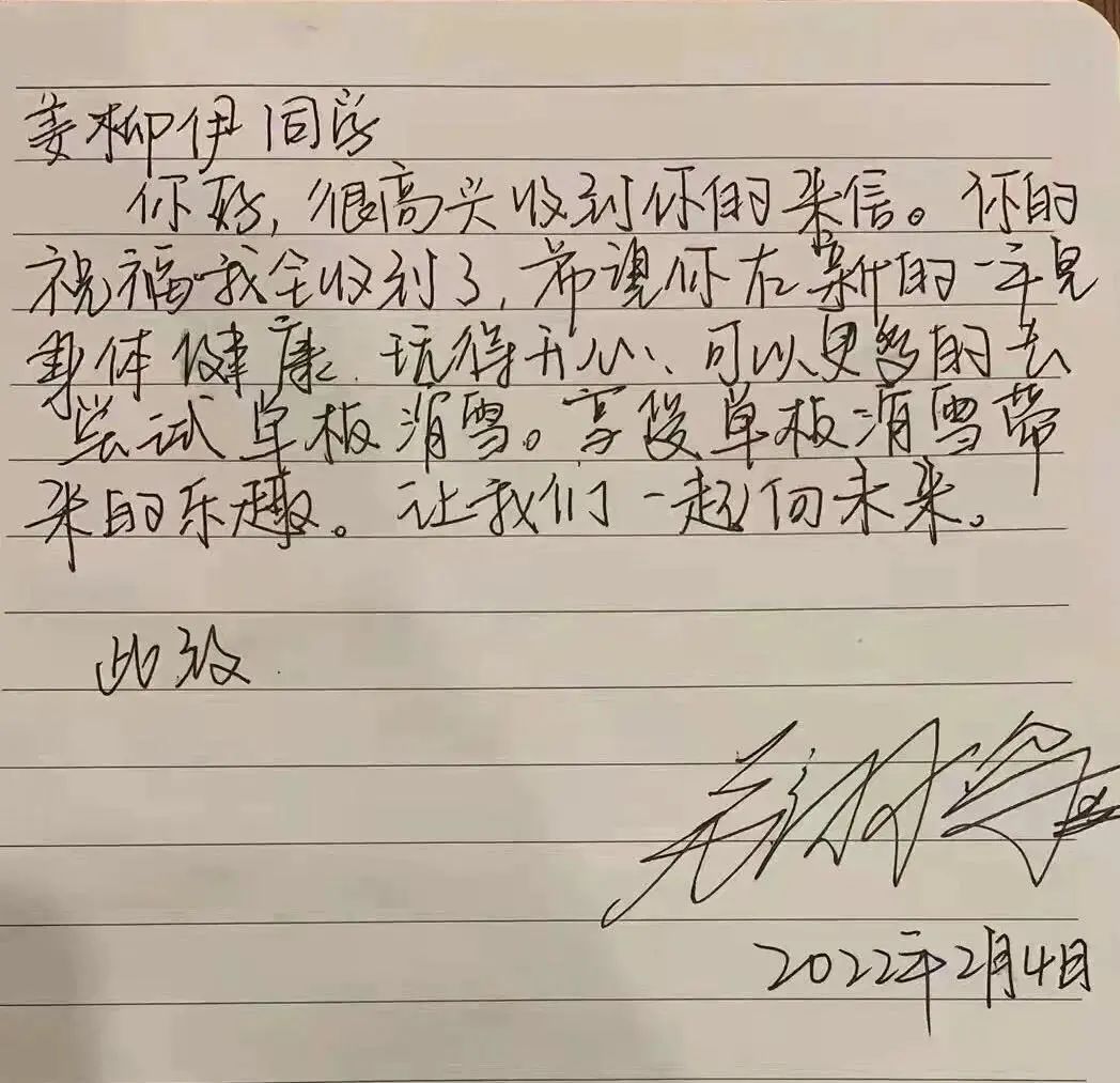 就在北京冬奥会开幕当天,她收到了苏翊鸣的亲笔回信。