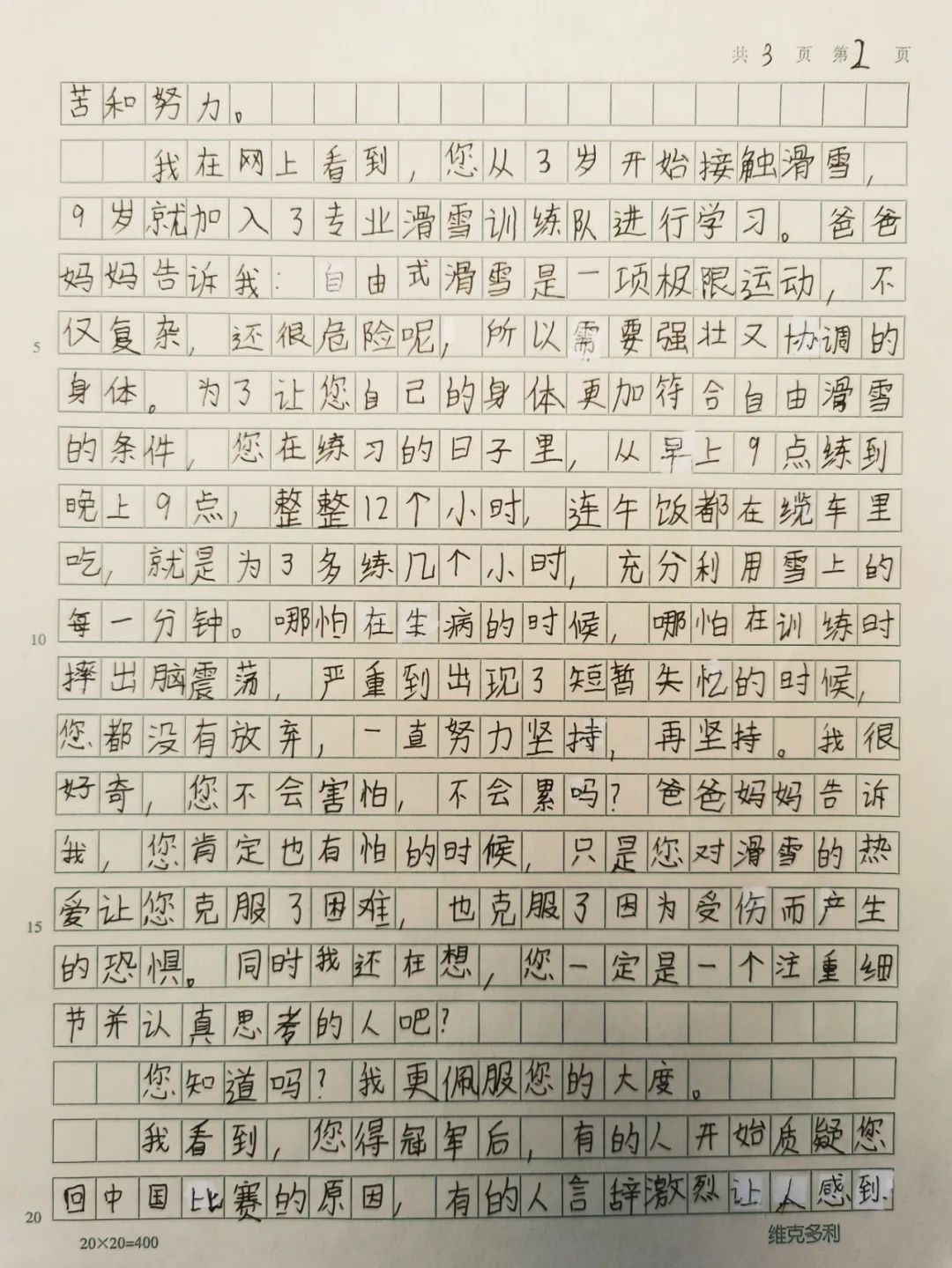 在信中,姜柳伊写道:“你让中国单板滑雪进入了世界一流水平的行列,同为00后你一直是我学习的榜样……”