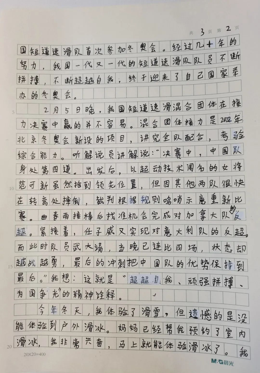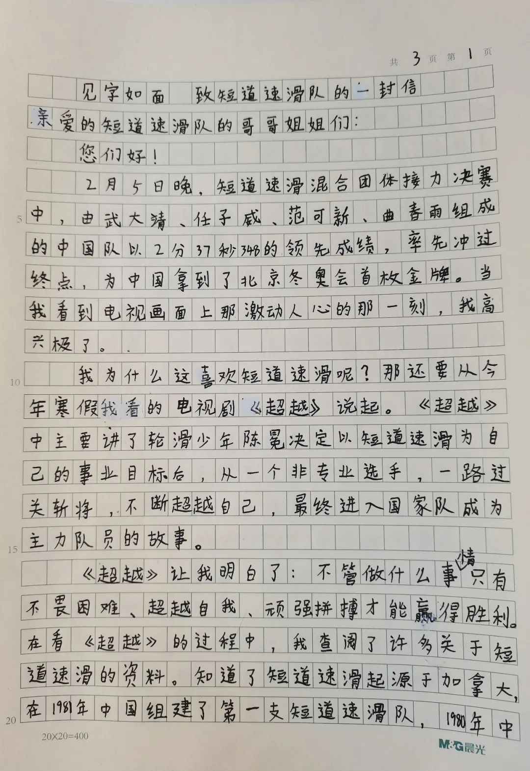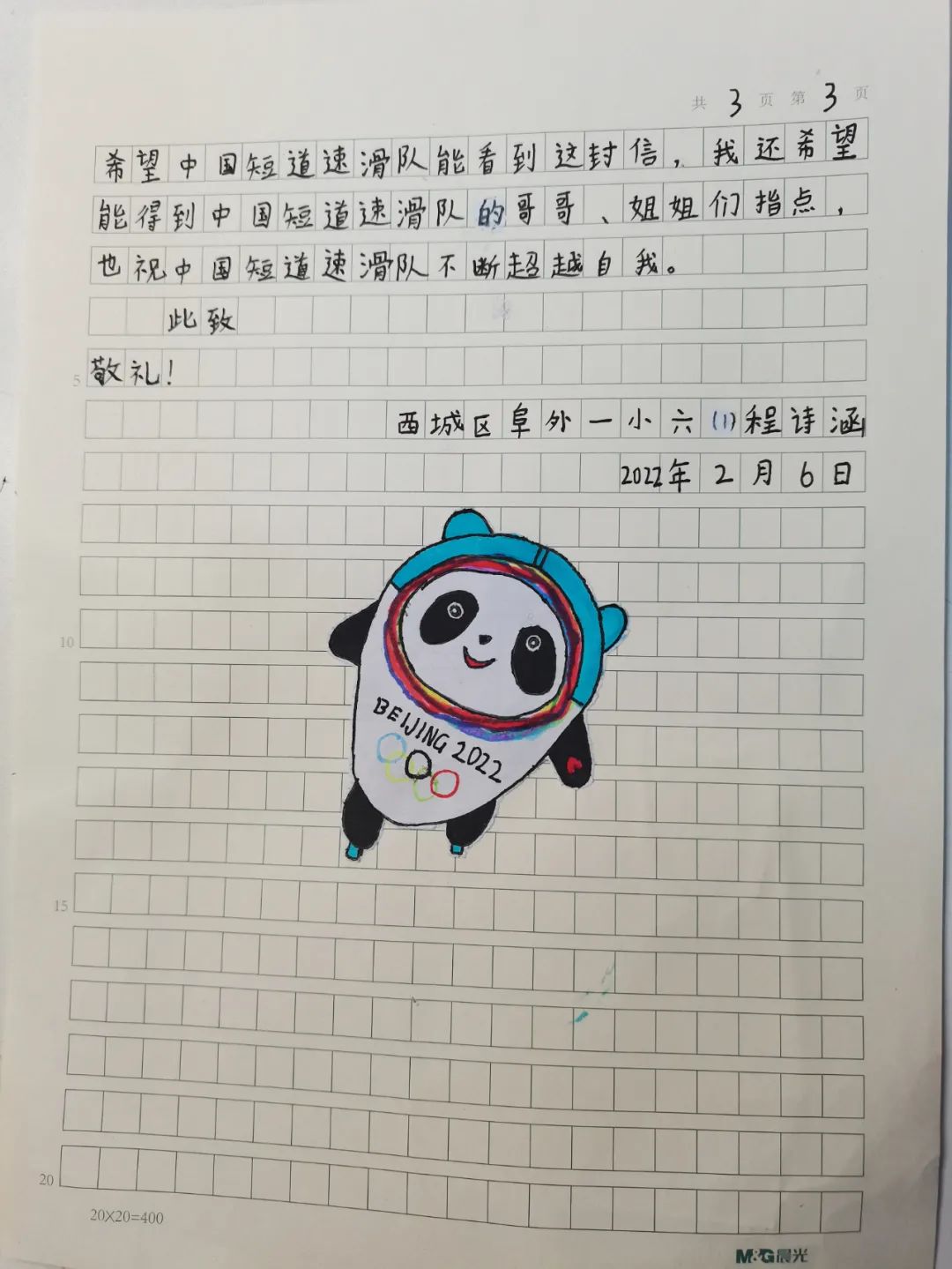 ⬆西城区阜外一小六(1)班程诗涵致信短道速滑队