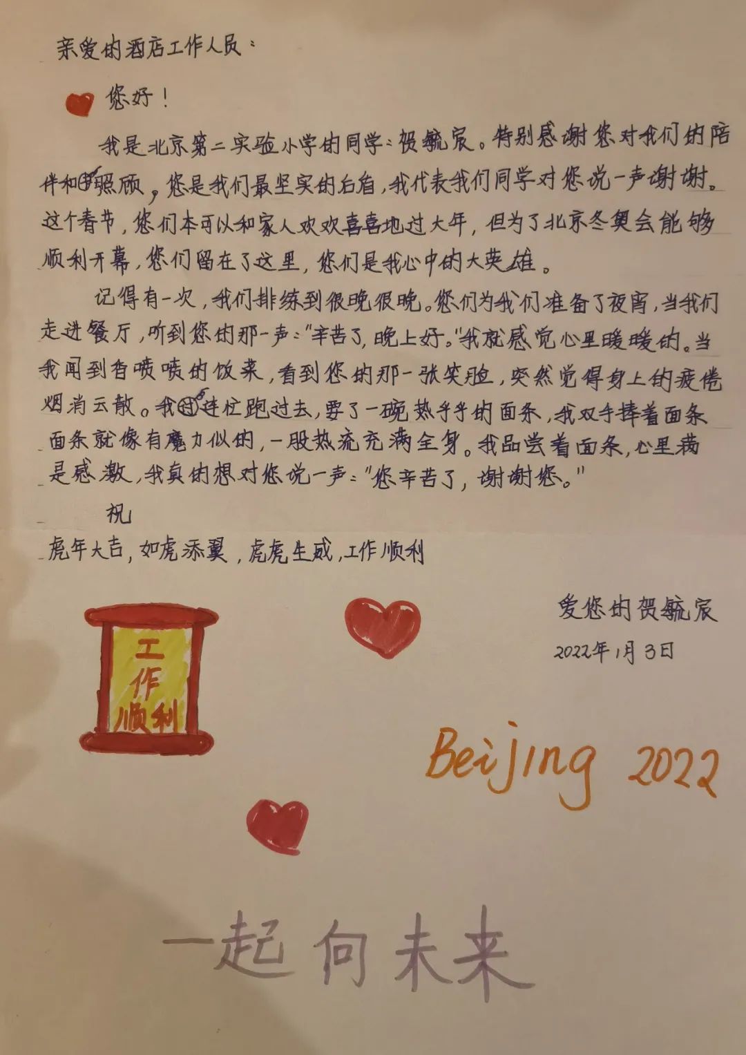 ⬆北京第二实验小学贺航宸致信冬奥会工作人员