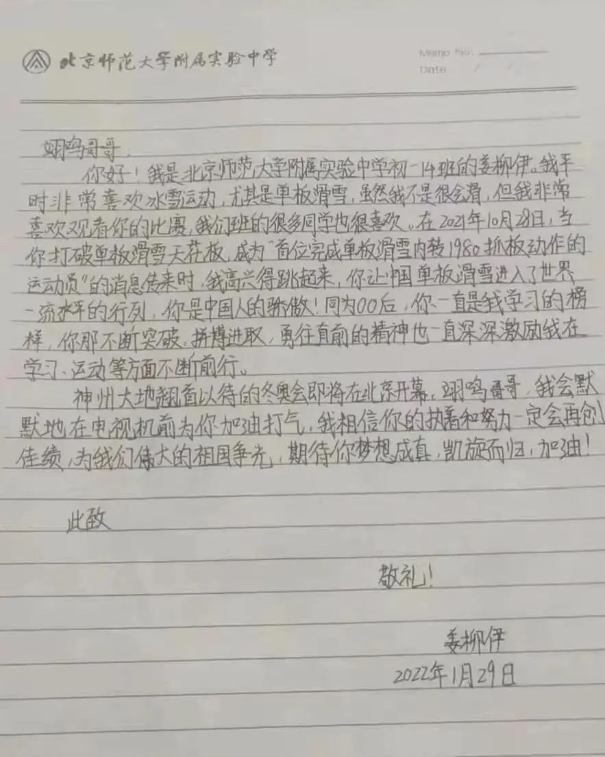 ⬆北京师范大学附属实验中学姜柳伊写给苏翊鸣的信