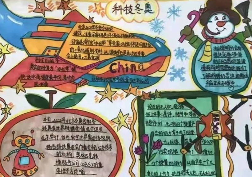手抄报中学知识,科技冬奥、绿色冬奥,学生们的作品中饱含着他们作为此次冬奥会主人翁的自豪感,他们用画笔推广冰雪运动知识,充分地展现了新时代少年对冬奥会的热切期盼与美好祝愿。