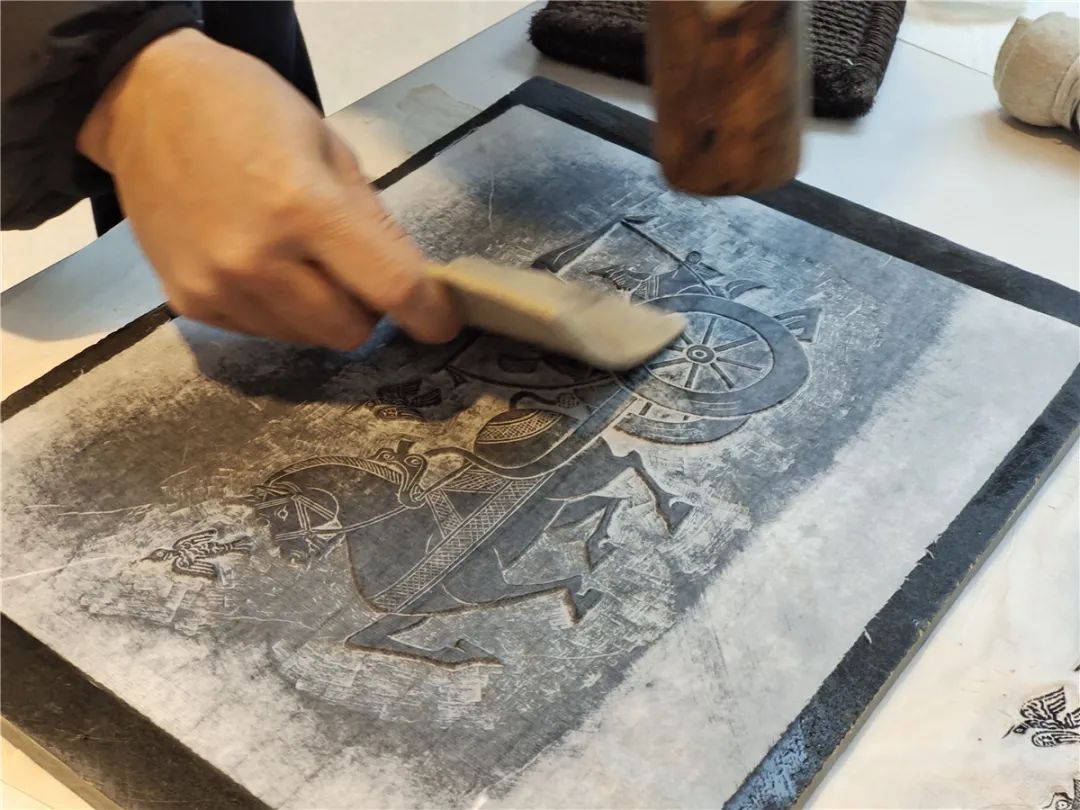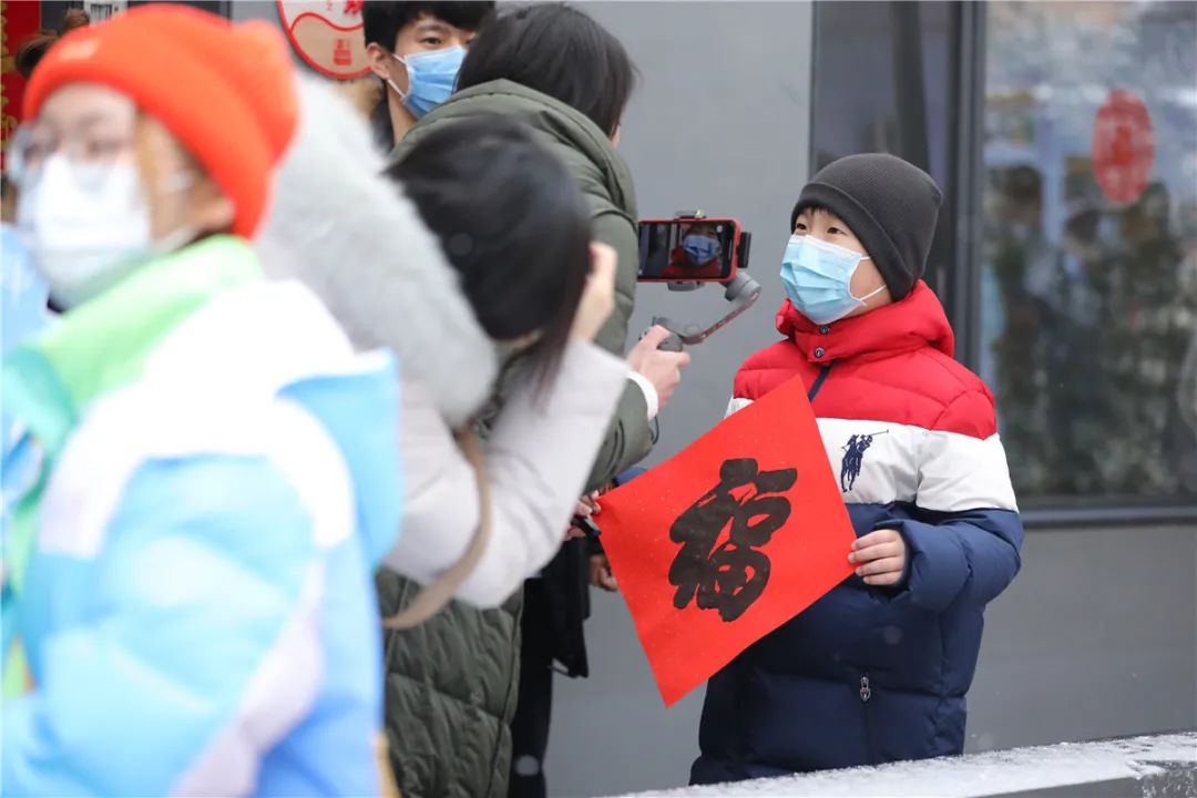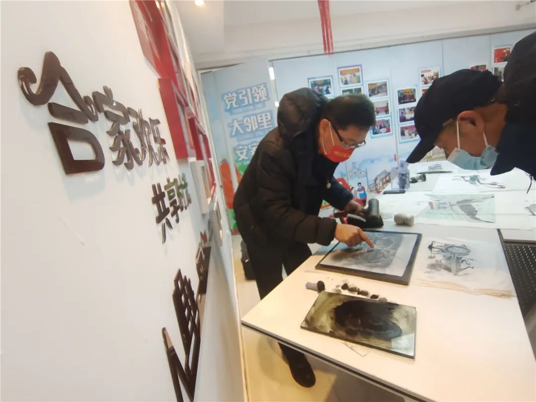 在主打党建品牌展示、党史学习、群众活动的“合家欢”里,记者们在非遗传承人的指导下,体验老字号传统的毛笔福字、彩拓石板及木版刷印等技艺。