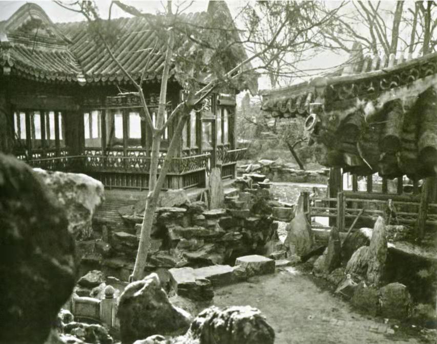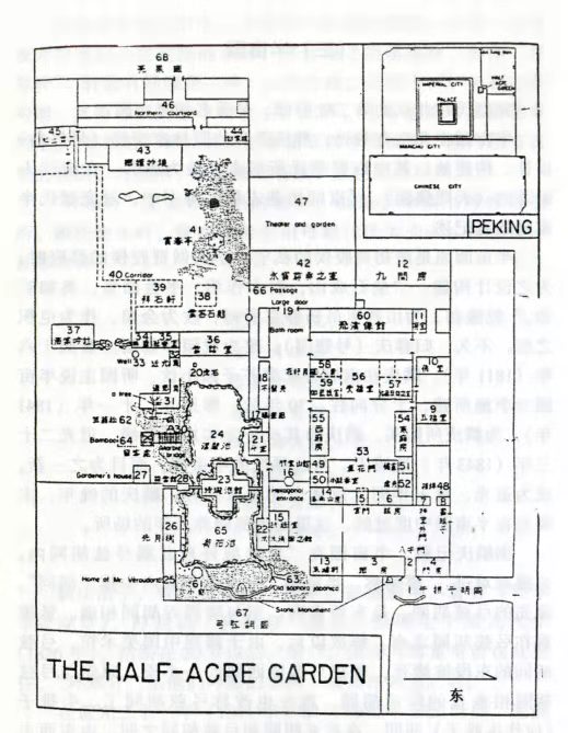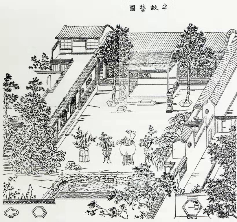 《天咫偶闻》记载了清末至民国时期半亩园的布局,“云荫堂南,大池盈亩,池中水亭,双桥通之,是名流波华馆。又有近光楼、曝画廊、先月榭、知止轩、水木清华之馆、伽蓝瓶室诸名。”这一时期的半亩园布局与麟庆设计的已经有了变化。