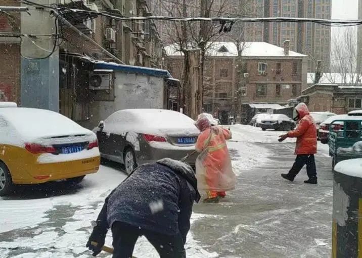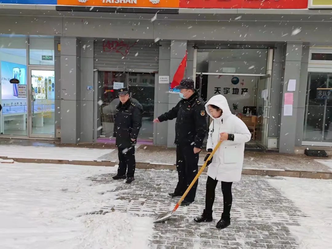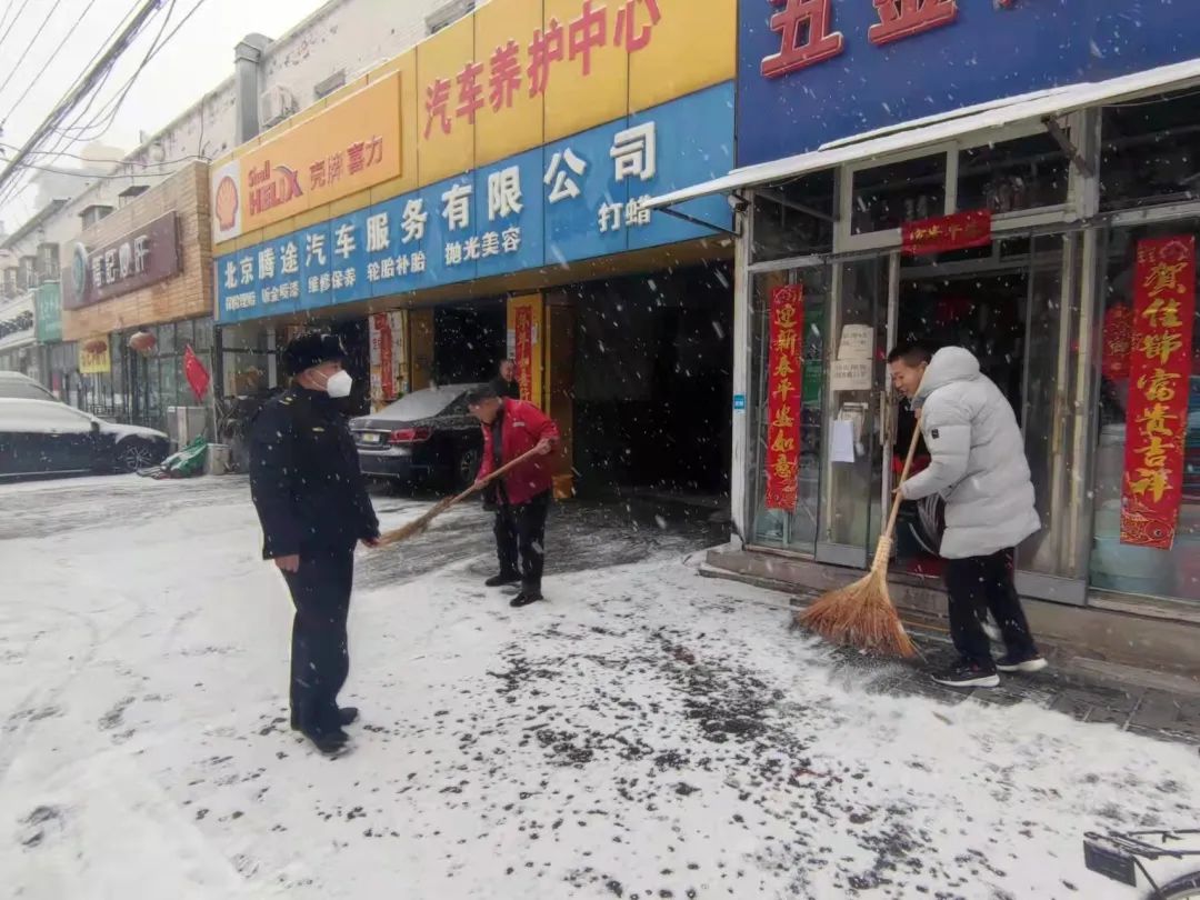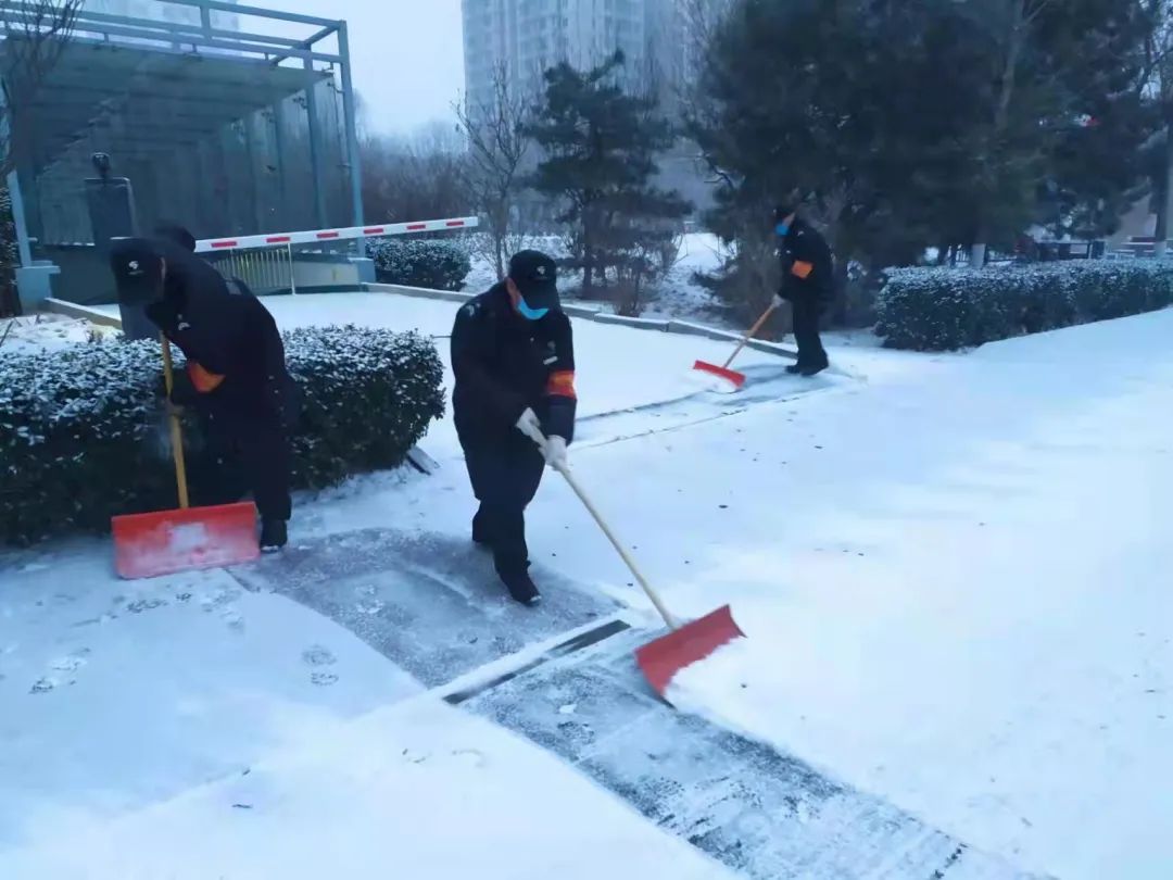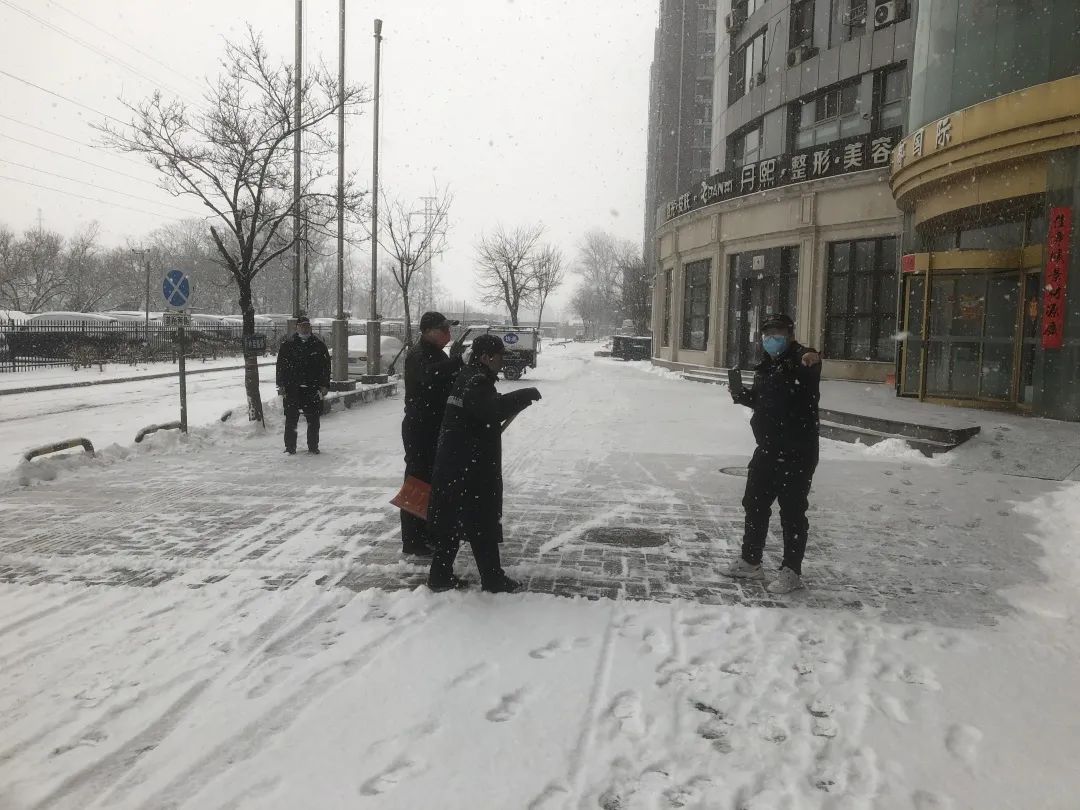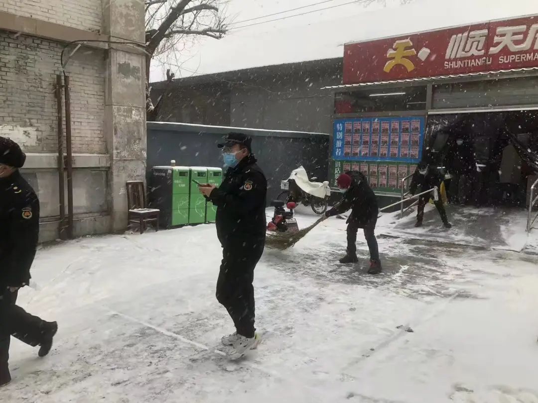 城市管理办公室积极开展巡逻检查,加大对涉奥酒店、老旧小区服务保障,并发动物业、环卫、保安保洁等社会力量,对门前三包区域、楼前道路等公共区域进行清扫、播撒融雪剂,确保道路无积雪、不结冰。