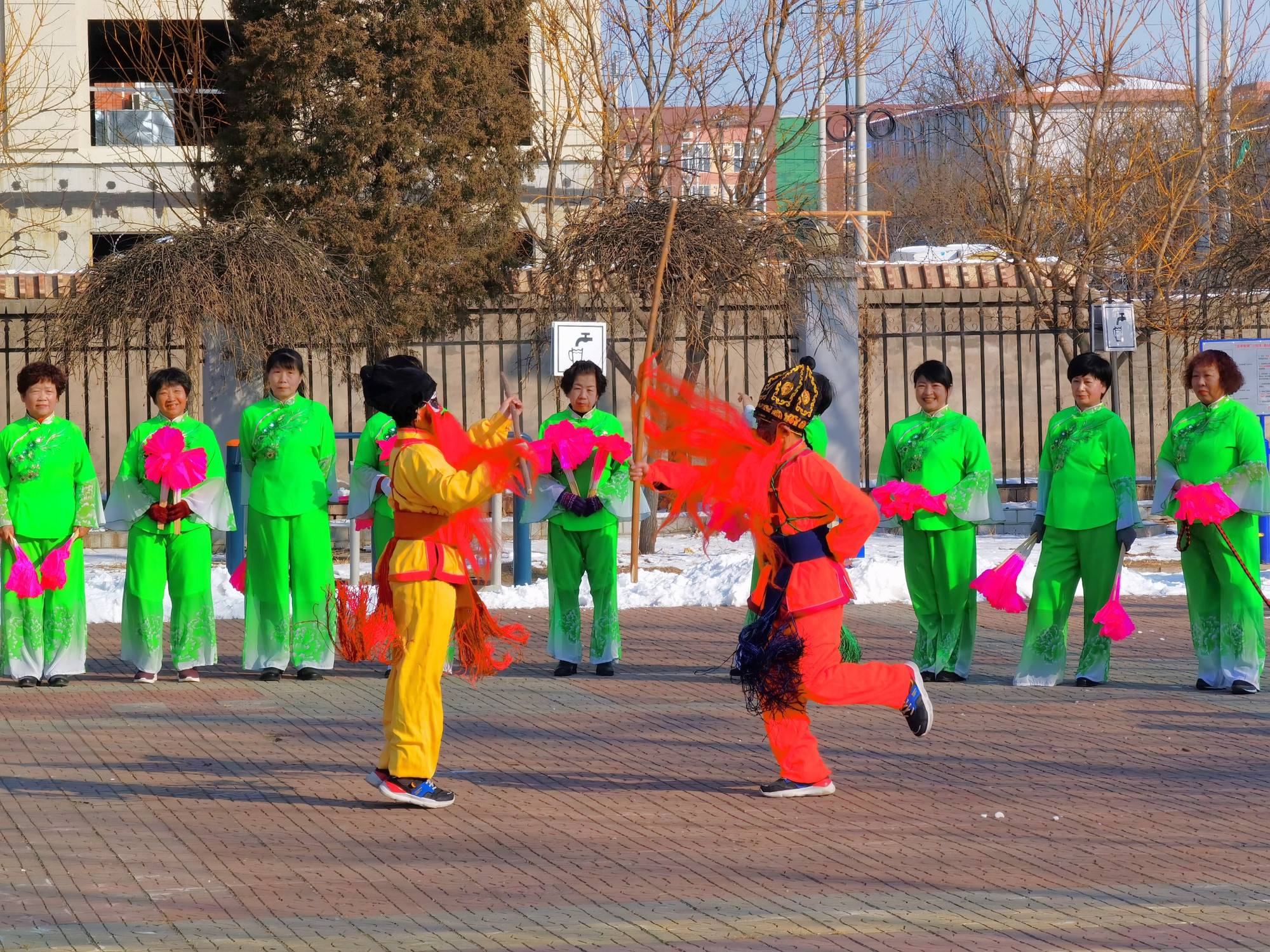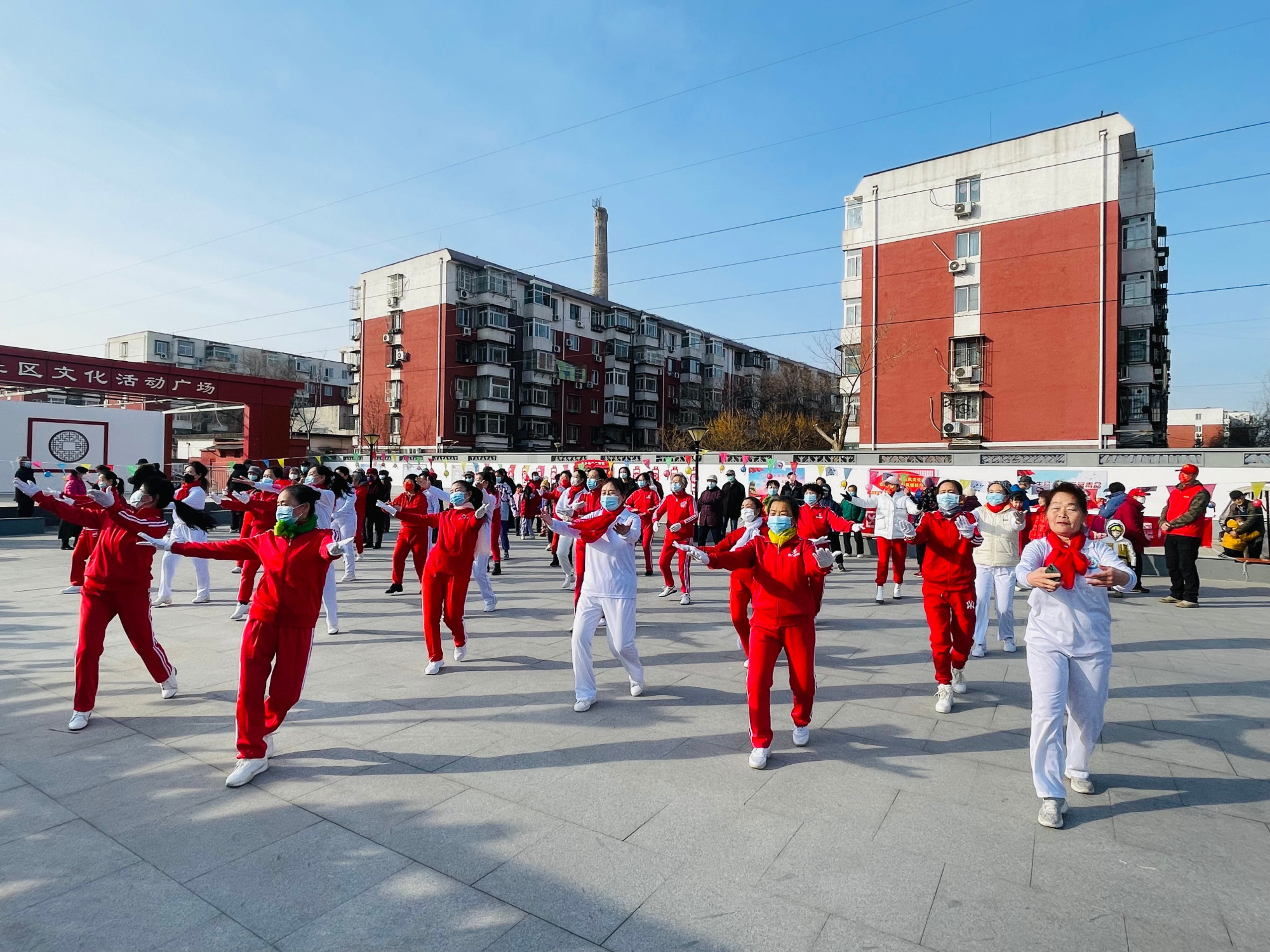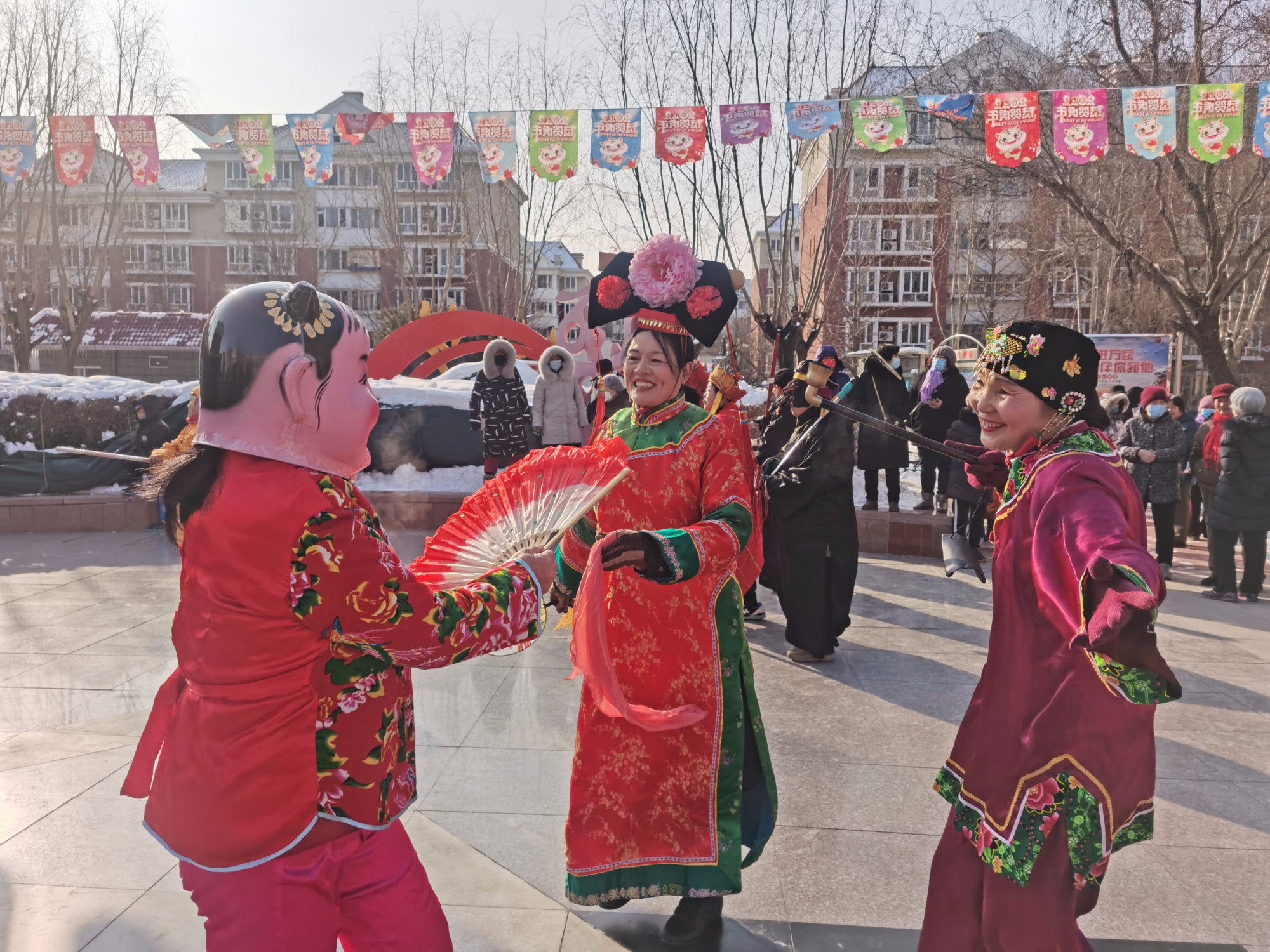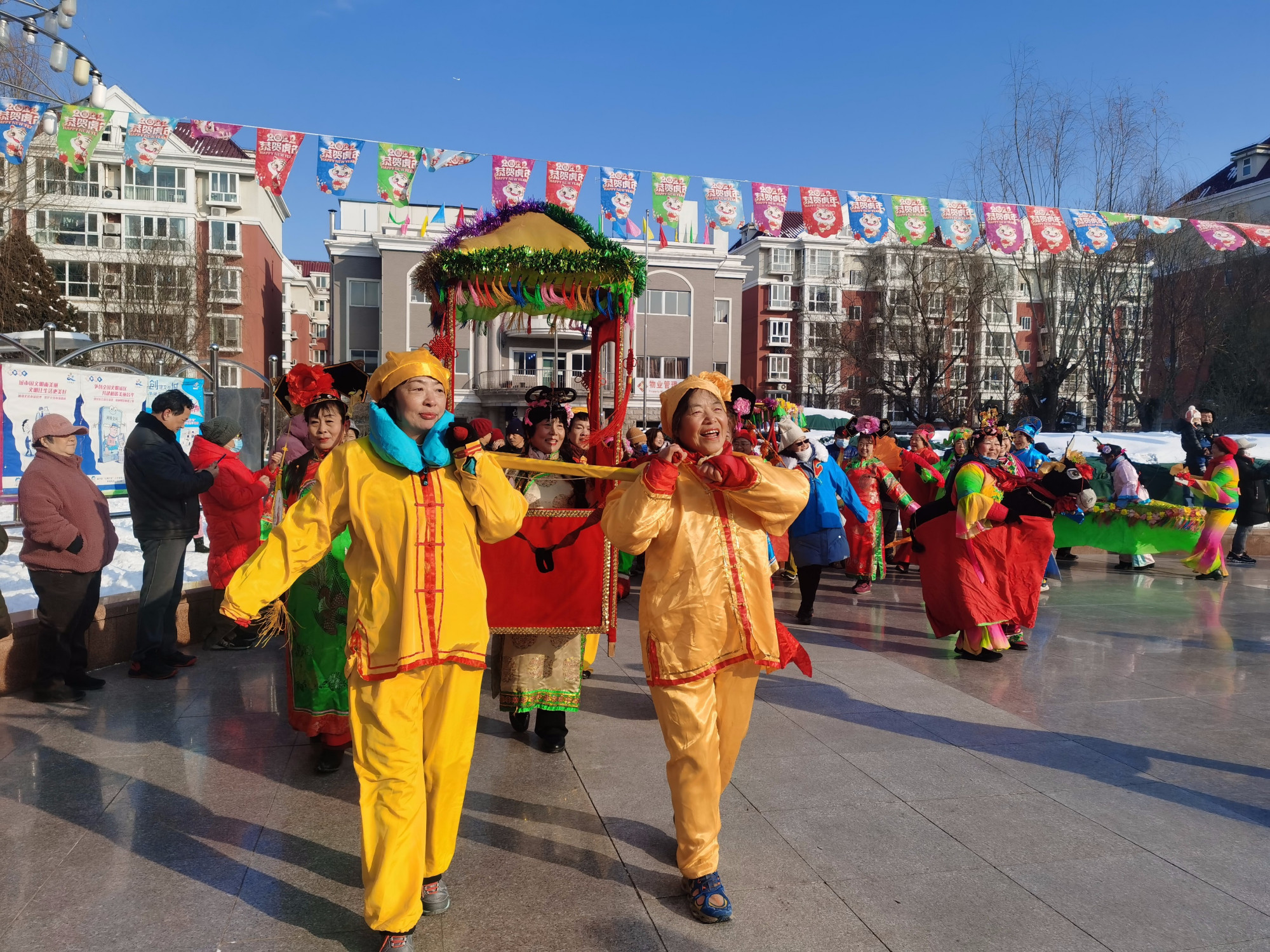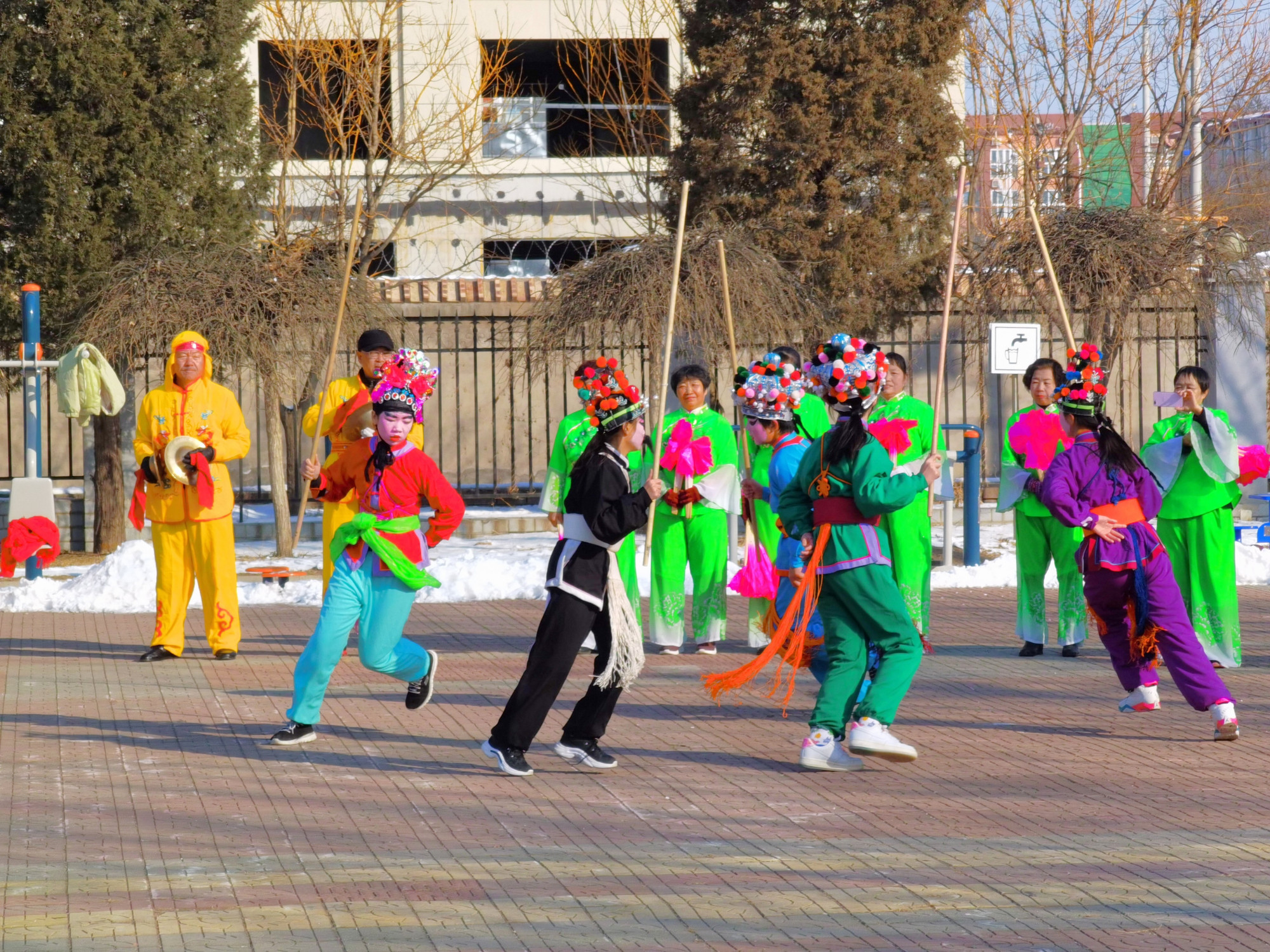 龙泽园街道北店嘉园社区也为居民准备了不少热闹节目。在社区广场,北店嘉园秧歌队“小车会”的表演者身穿鲜艳演出服,在激昂的鼓声、唢呐声中闪亮登场。他们诙谐的表情动作、特色的装扮和道具,成为了社区里一道靓丽的风景线,吸引了众多居民前来观看。