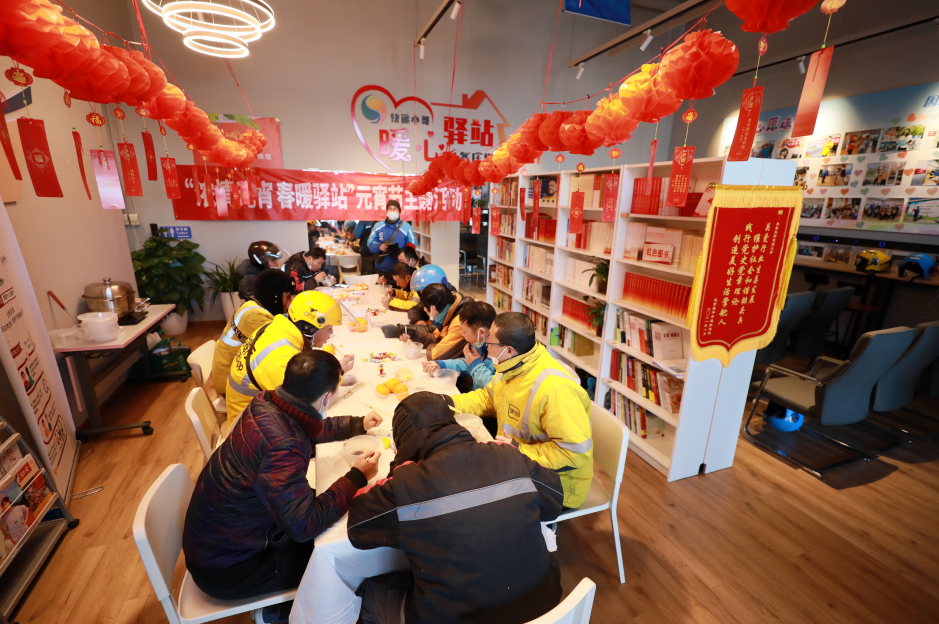 暖心驿站被中国结、红灯笼装扮的“年味儿”十足。桌子上,整整齐齐的摆着果盘、糖果、小礼物,等待着“小哥”们的到来。“小哥”们刚到驿站,大家便相互问好,不约而同地端起煮好的元宵,一同品尝。大家边吃边聊,还有“小哥”欢快地哼唱起了家乡歌曲,现场好不热闹。