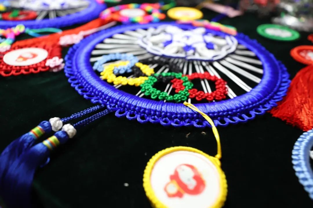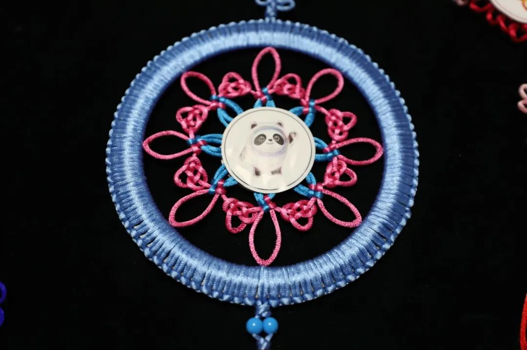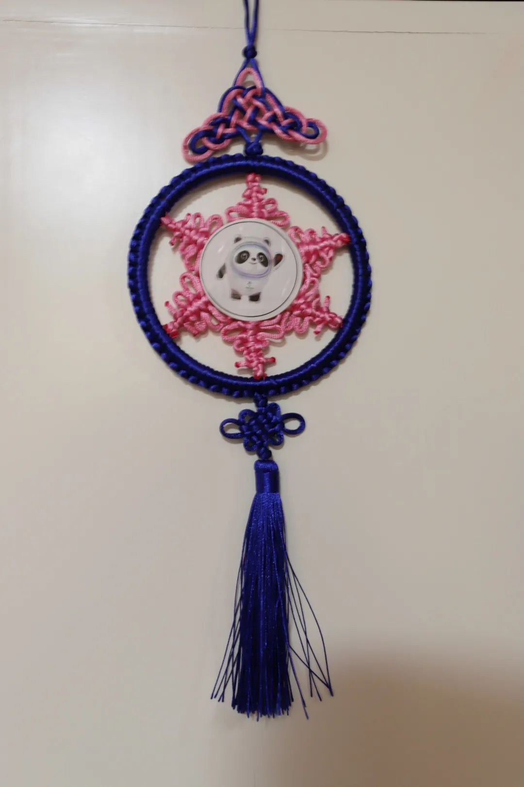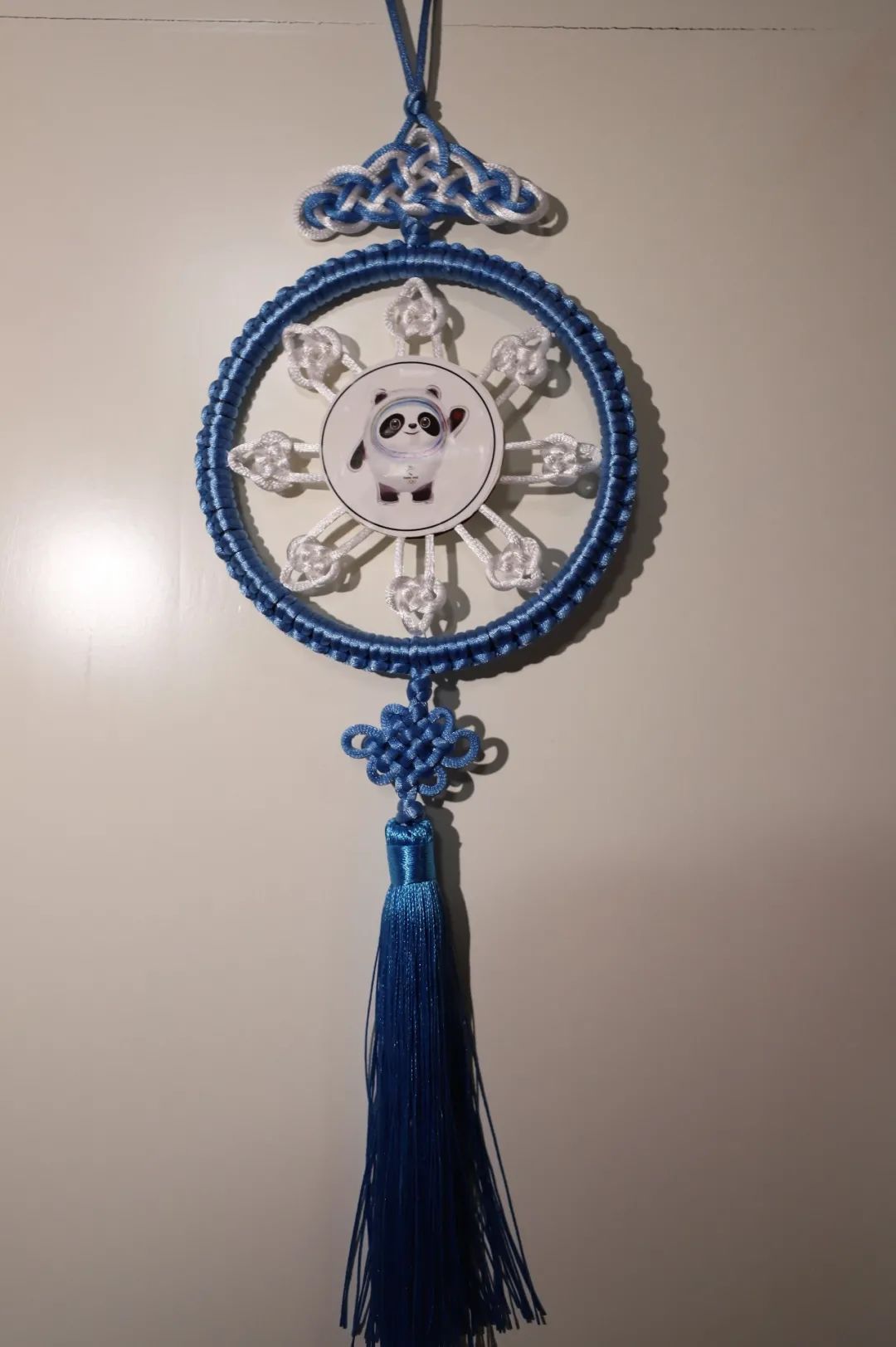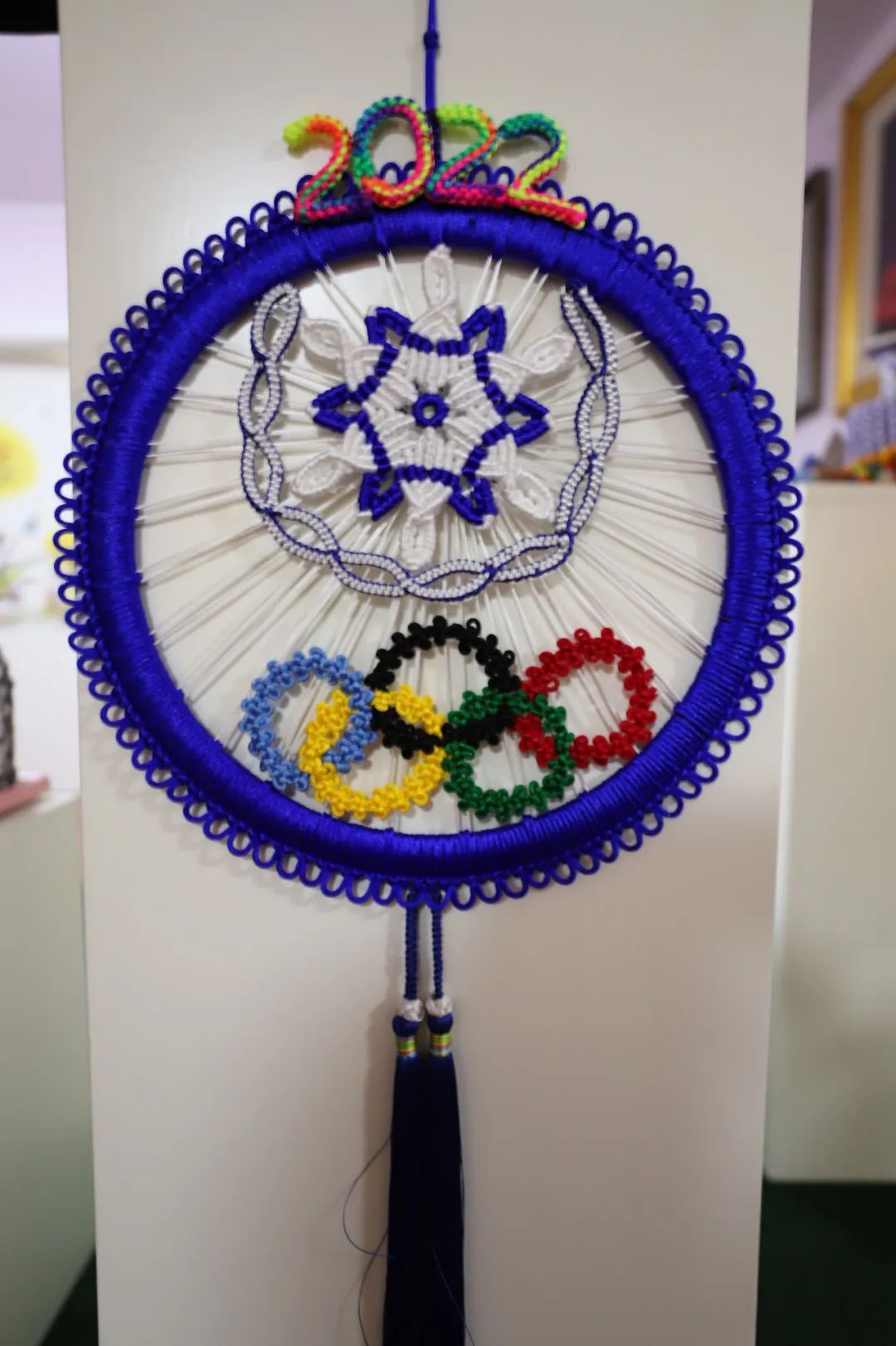 “这些作品中采用了平结、双联结、冰花结、玉米结、团锦结、酢浆草结、盘长结、双钱结、纽扣结、祥云结、十全结、笼目结、吉祥结等不同的结式。团锦结是团结的象征,祥云结有吉祥如意的寓意。”说起结艺,朱静宜格外兴奋。冬奥主题结艺作品的灵感很多都是朱静宜和编织小组成员们自己构思出来的,比如,用白色的直线铺底,象征着冰面;用纽扣结等隔出平行线或交叉线,象征着滑道……