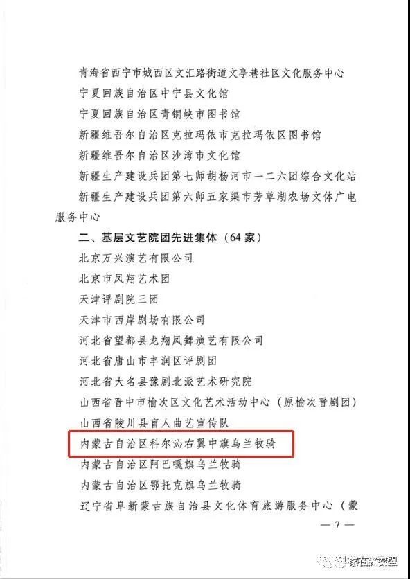 近日,中共中央宣传部发布《关于第九届全国服务农民、服务基层文化建设先进集体拟入选单位公示》,全国共有64个基层文艺院团入选,科右中旗乌兰牧骑成为兴安盟唯一获此殊荣的文艺院团。
