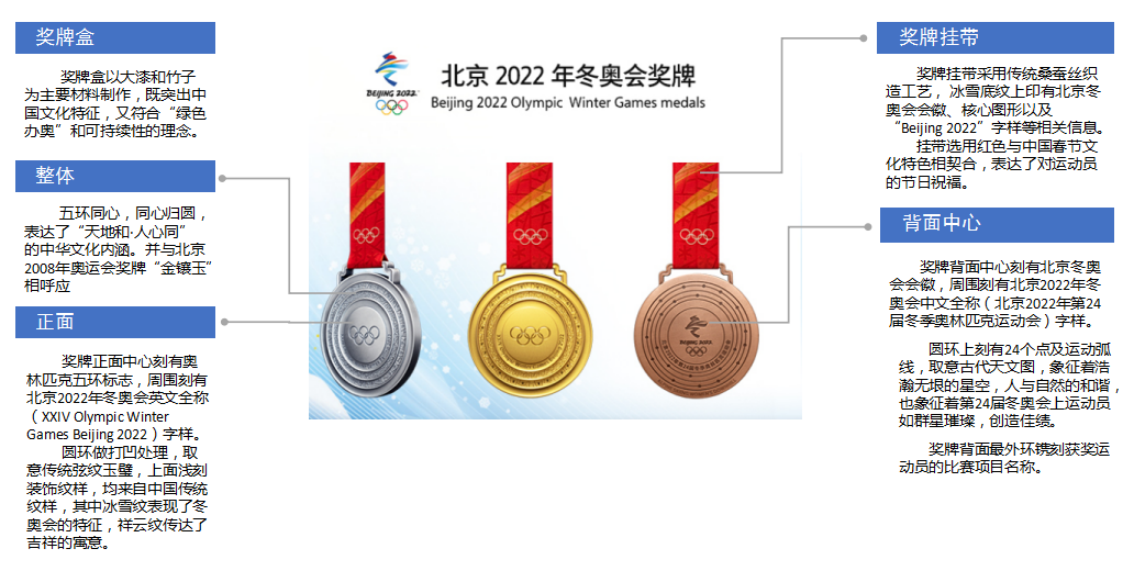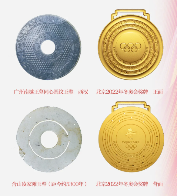 北京2022年冬奥会奖牌,由圆环加圆心构成牌体,形象来源于中国古代同心圆玉璧,共设五环。