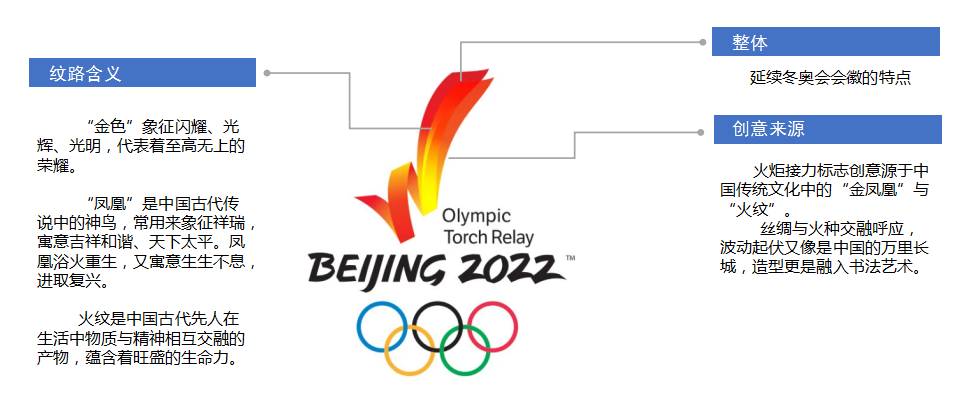 火炬接力标志延续冬奥会会徽的特点,创意源于中国传统文化中的“金凤凰”与“火纹”。丝绸与火种交融呼应,波动起伏又像是中国的万里长城,造型更是融入书法艺术。