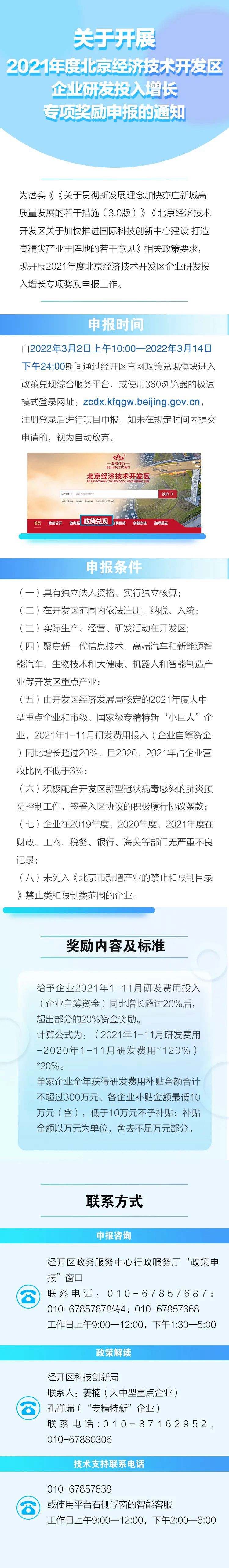 详情请关注“北京亦庄”微信公众号,打开“2021年度北京经开区企业研发投入增长专项奖励如何申报?一图读懂→”一文,查看办事指南。