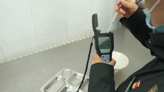 在大兴一中,检查人员针对学校食品安全管理制度落实情况、从业人员健康体检、环境卫生、设备设施、食材原料索证索票、食品储存、加工制作、餐具清洗消毒、留样管理等程序是否符合规范要求开展了重点检查,并对餐具洁净度进行了检测。