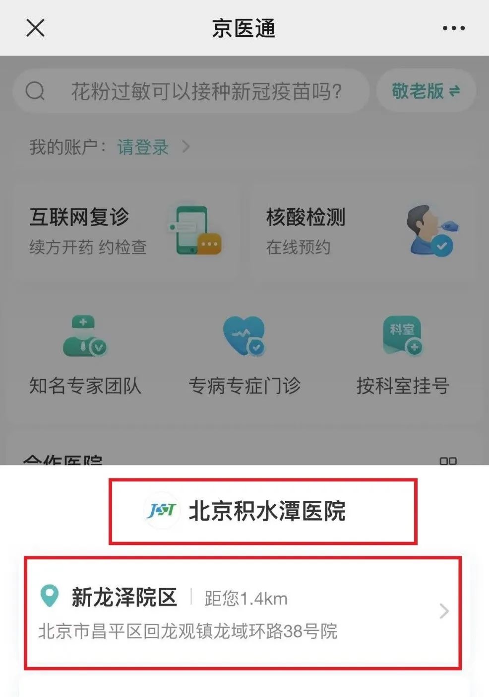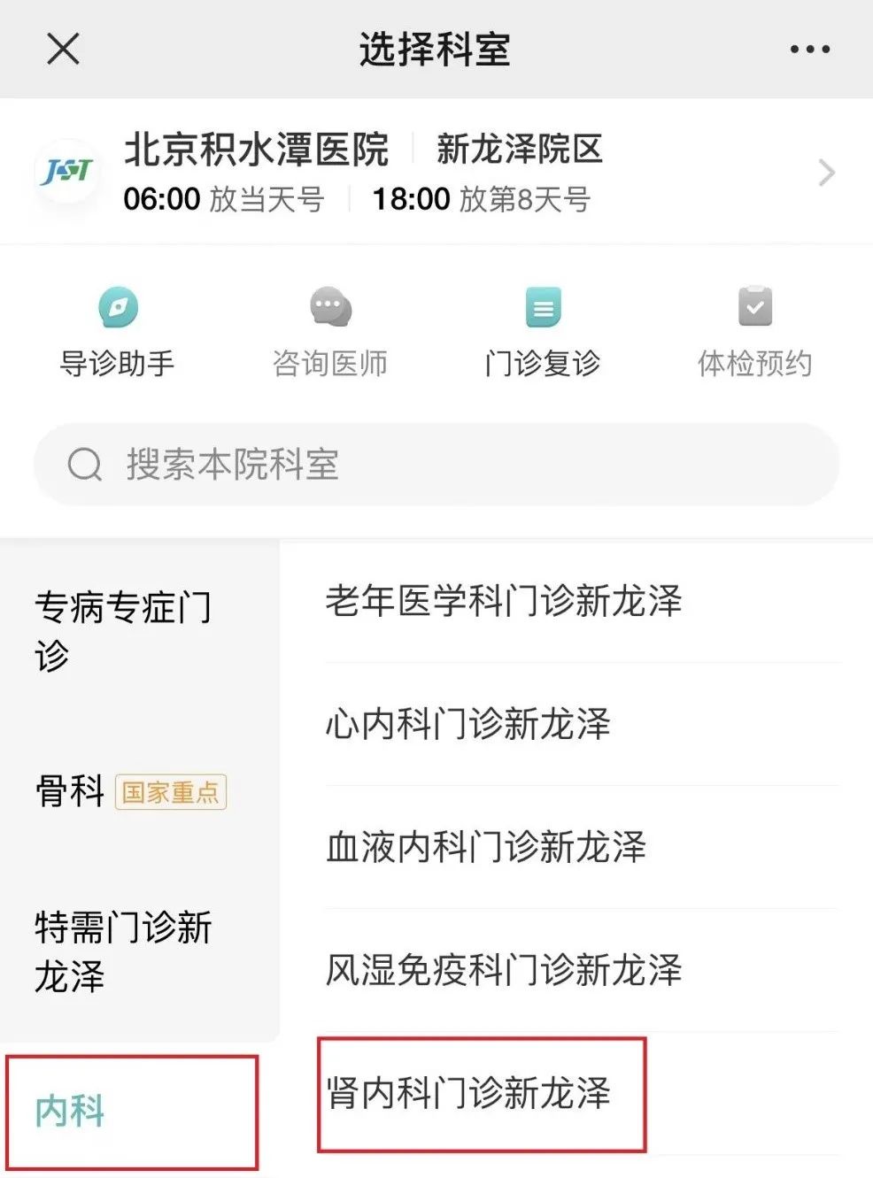 01、打开京医通,选择北京积水潭医院,新龙泽院区。