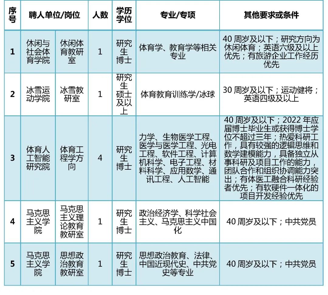 请应聘人员进入首都体育学院校园网( https://www.cupes.edu.cn ),点击“通知公告”栏中的“首都体育学院2022年公开招聘公告”,进入:“招聘系统”(请点击进入)查询招聘岗位和具体条件。