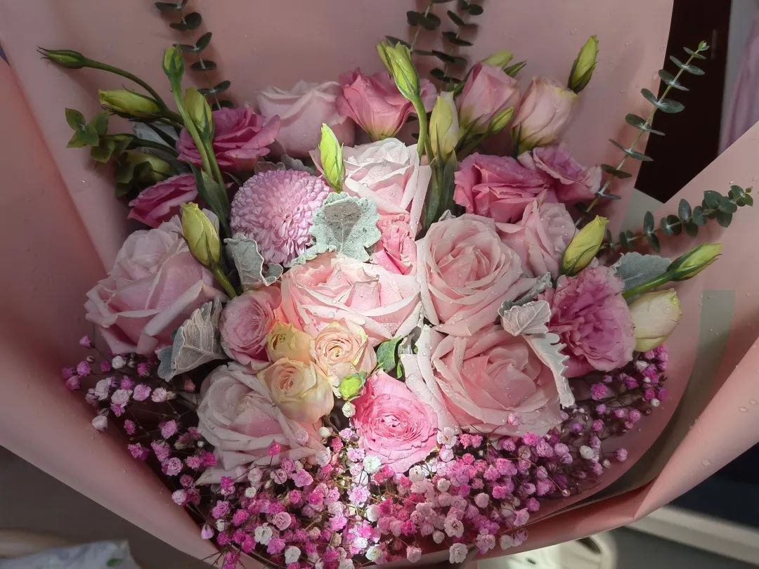 原来是家属今天来医院办理结账手续,想当面向科主任表达谢意。因疫情防控需要不方便在科内接待,科主任匆匆下楼,患者家属连忙迎上来,将一捧精心准备的鲜花及锦旗送到刘宁红的手中,不断地说着感激的话语,感谢这半年多以来肿瘤内科医护人员及护工阿姨全方位的照护。“祝全体医护人员妇女节快乐!”家属为科室全体医护人员送上了衷心的节日祝福。