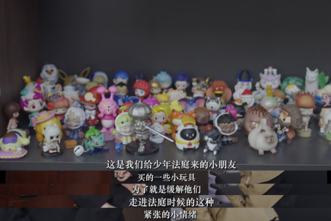 秦硕办公室的书柜中,有一层摆满的了各式各样的小玩偶。一边是书卷,一边是玩具,但在这位少年法庭法官的办公室里却不显得突兀。秦硕的这些小玩具都是给来少年法庭的小朋友们准备的,摆在这里任孩子们挑选。玩具虽不大,却能吸引孩子的注意力,帮助他们缓解走进法庭时紧张的小情绪。作为一位女法官,一位少年法官,秦硕通过温暖的细节和女性独特的方式呵护着孩子们的心灵,一间充满爱的办公室,亦是守护未成年人的堡垒。