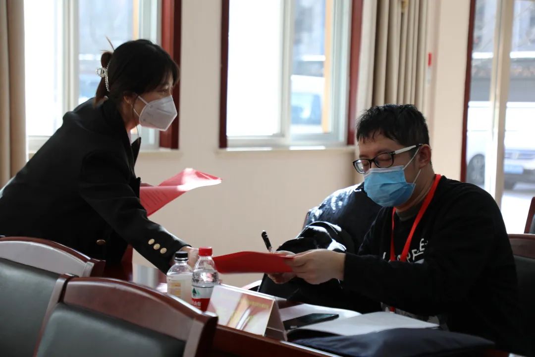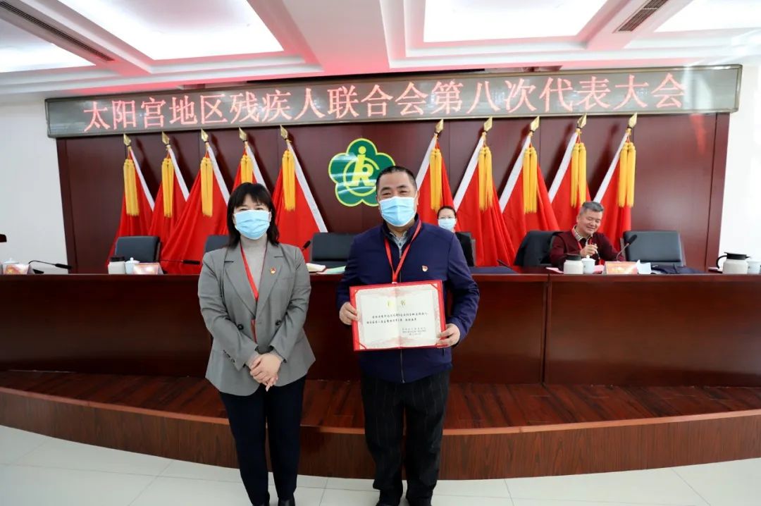 太阳宫地区残联第八届主席团主席文艳萍,向太阳宫地区残联第八届主席团名誉主席李华颁发了聘书。