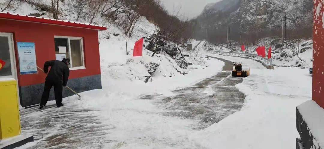 大庄科乡根据预报预警,严格落实24小时应急值守制度,乡应急队、各村保洁员290人全员出动,配备机械设备5辆,人工除雪设备200件,固态融雪剂25吨,在乡域内主干道、辖区交界带等重点区域开展积雪积冰清理工作。