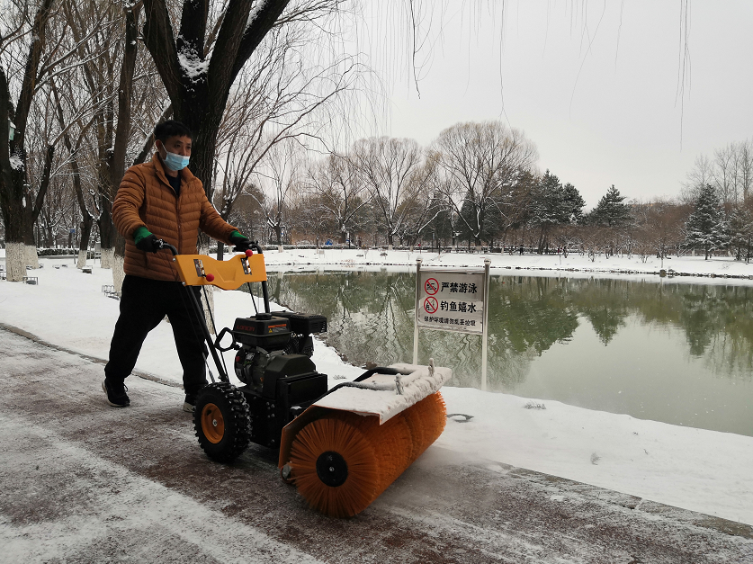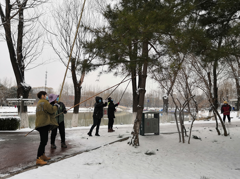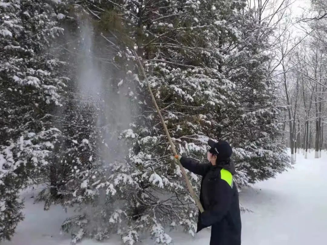 为确保市民群众安全游园,区园林绿化局全面排查辖区内公园绿地安全隐患,对城区主要公园内人行步道、广场等铺装路面进行清扫,防止积雪结冰;同时加强对绿化带、路树的巡视检查,做好雨雪降温天气造成损毁倒伏树木、树枝的及时清理;因常绿树树叶较多,容易积雪断裂,园林绿化局300余人组成的“竹竿队”立即行动,对重要路段、重点区域,集中力量清理道路两侧和公园内常绿树树梢积雪,避免树枝断裂,此次降雪共出动职工1000余人、扫雪机10辆、车辆30余辆,人工除雪设备铲雪板、扫帚、铁锹等800余个,确保行人生命安全和城市交通畅通。