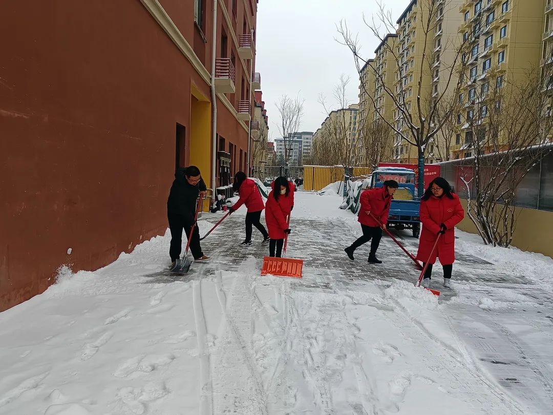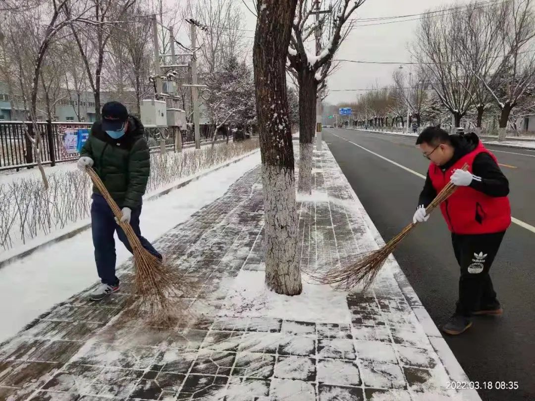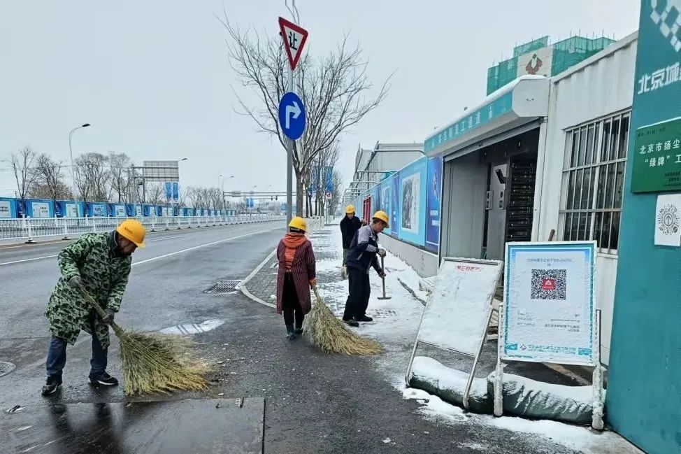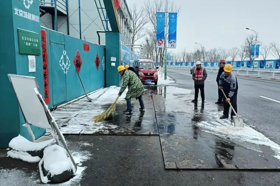 雪情就是命令,区住建委接到预警通知后,第一时间向行管企业发布扫雪铲冰通知,并立即启动扫雪铲冰应急预案,组织延庆在建工程项目开展“门前三包”区域扫雪铲冰工作,及时将项目门前、宿舍区、施工现场等部位积雪清除,确保环境干净整洁。