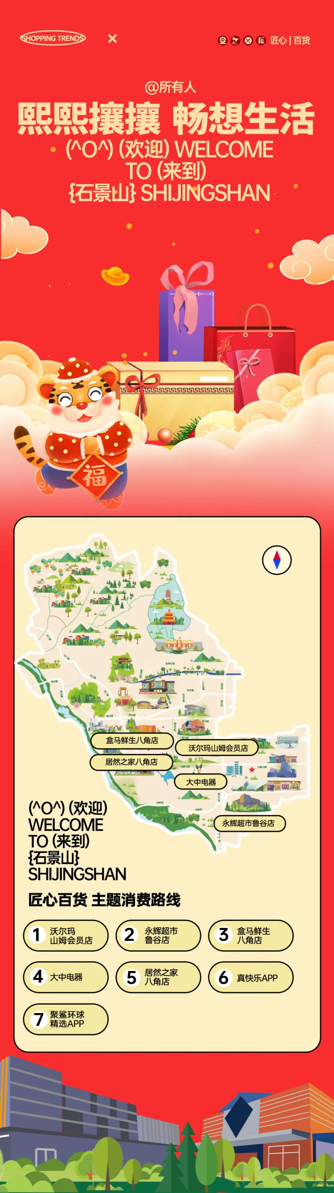 匠心百货:熙熙攘攘,畅想生活石景山的沃尔玛山姆会员店是全北京第一家山姆会员店,并且常年保持全球销量前三;永辉超市鲁谷店是永辉超市在北京的第二大店,面积约2万平方米,生鲜、果蔬种类多,而且特别新鲜;“真快乐”APP是国美旗下的购物平台,为用户提供全新网购体验,引领年轻人快乐新生活。盒马鲜生八角店、大中电器石景山店、居然之家八角店、聚鲨环球精选APP等涵盖线上线下,什么吃的、玩的、用的,不用出石景山都可以满足您的所有需求。