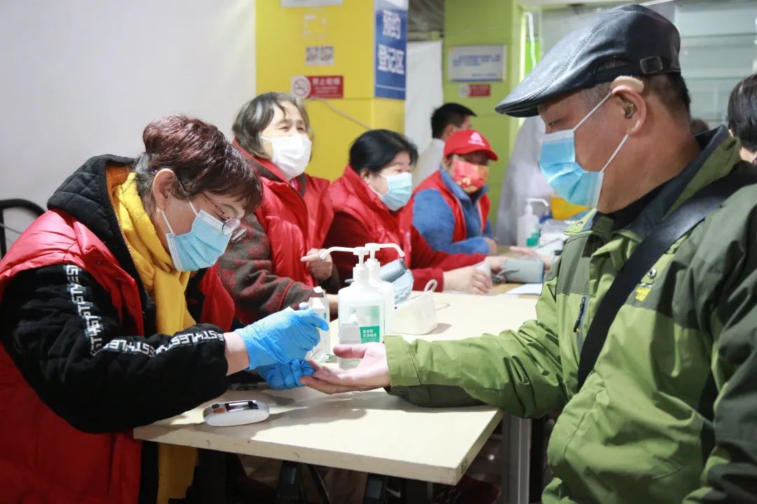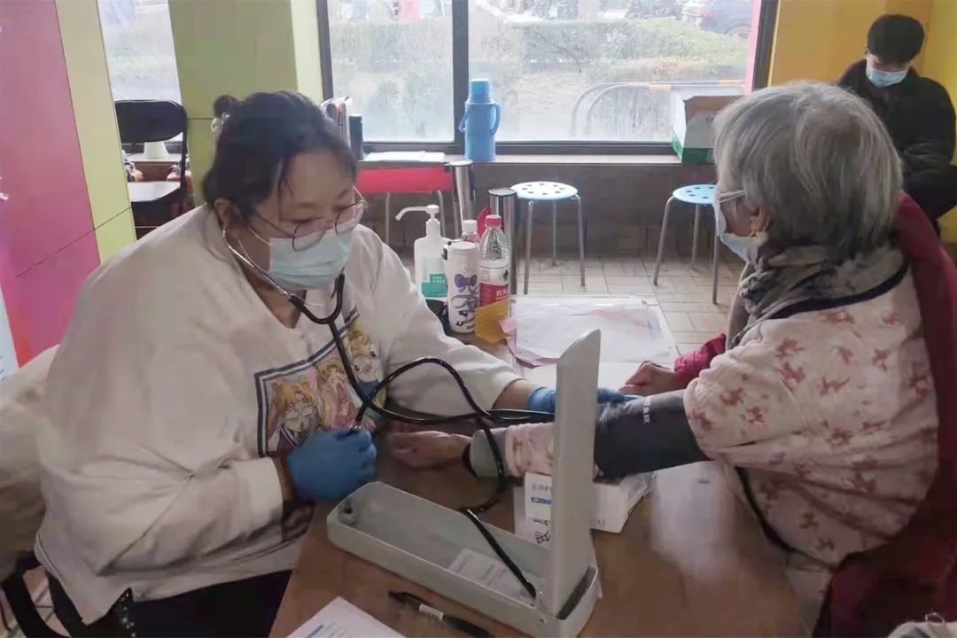 曙光里社区小芳为老志愿服务队为接种疫苗的老年人测量血糖。