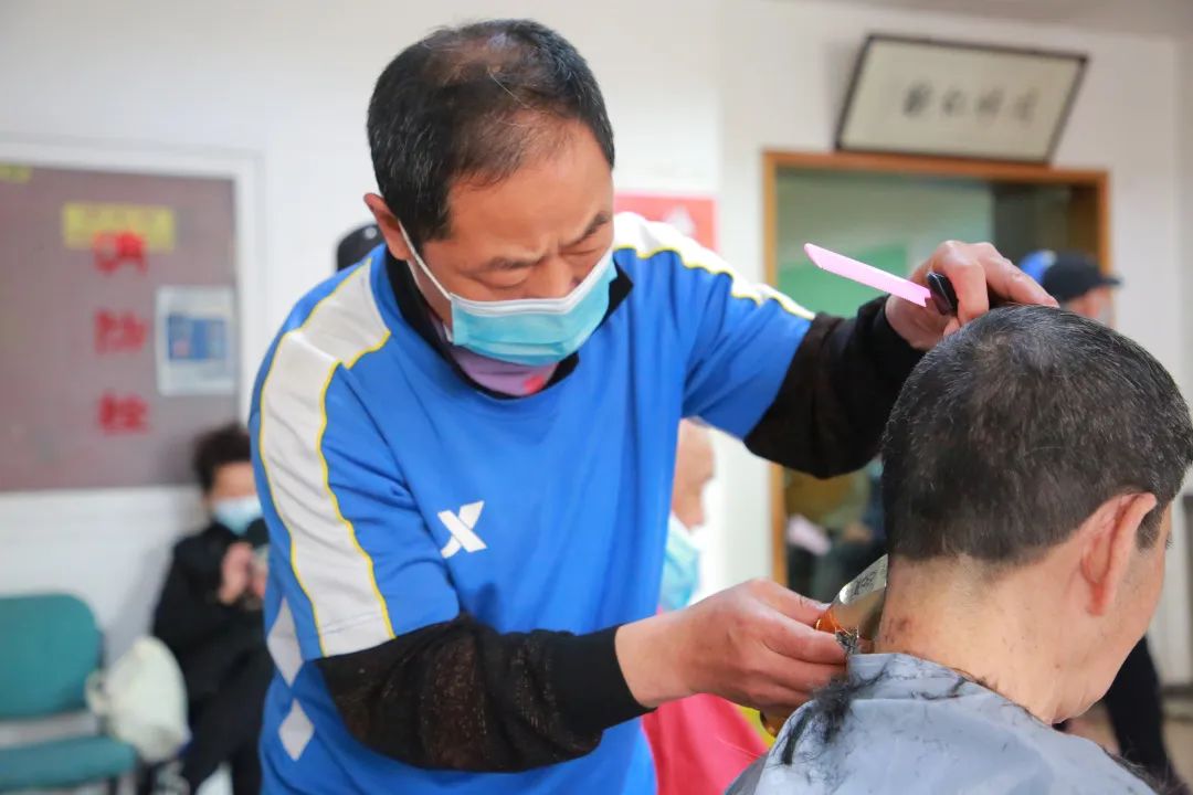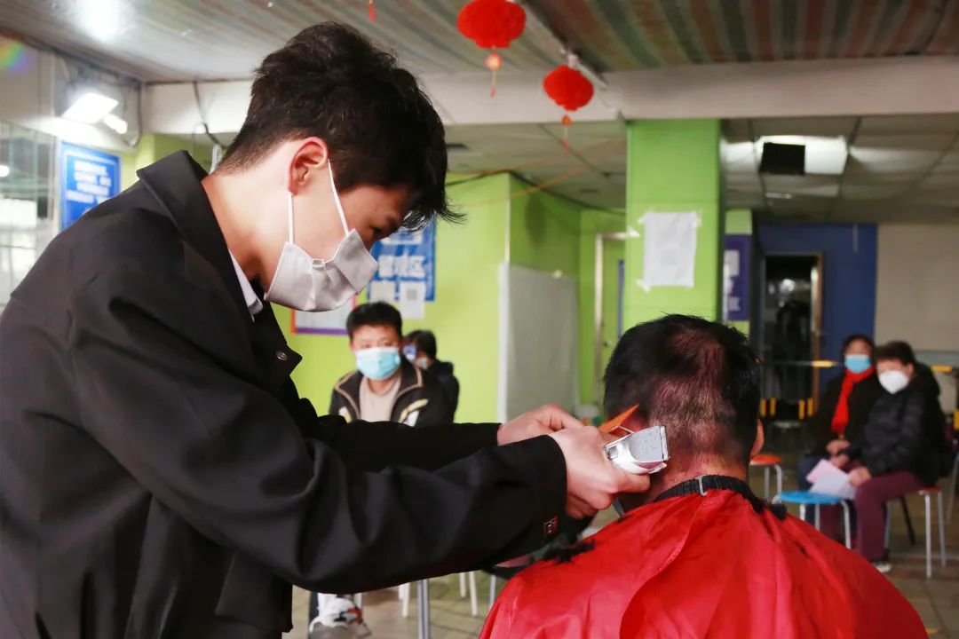 北京沙宣学院为疫苗接种点留观的老年人进行义务理发。