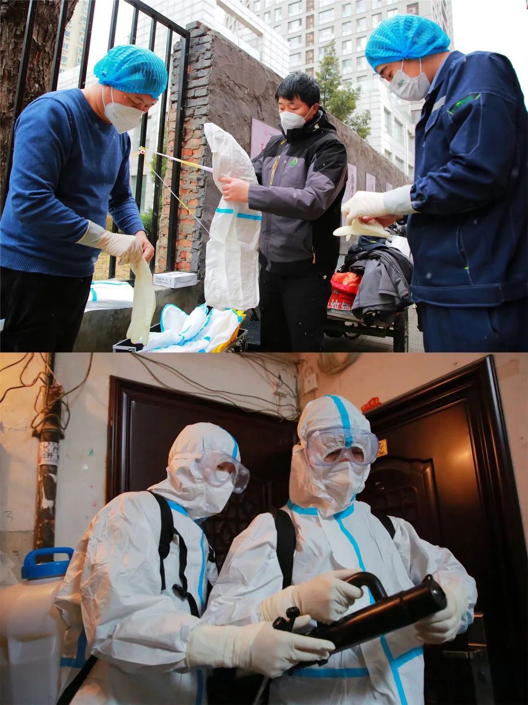 北京绿巨人生物科技有限公司整理消杀装备,免费为居民楼道进行环境消杀。