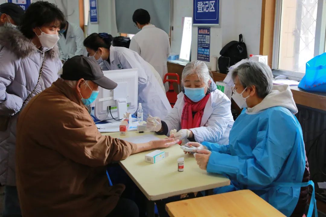 新源里社区李大夫工作室为接种疫苗的老年人测量血糖。